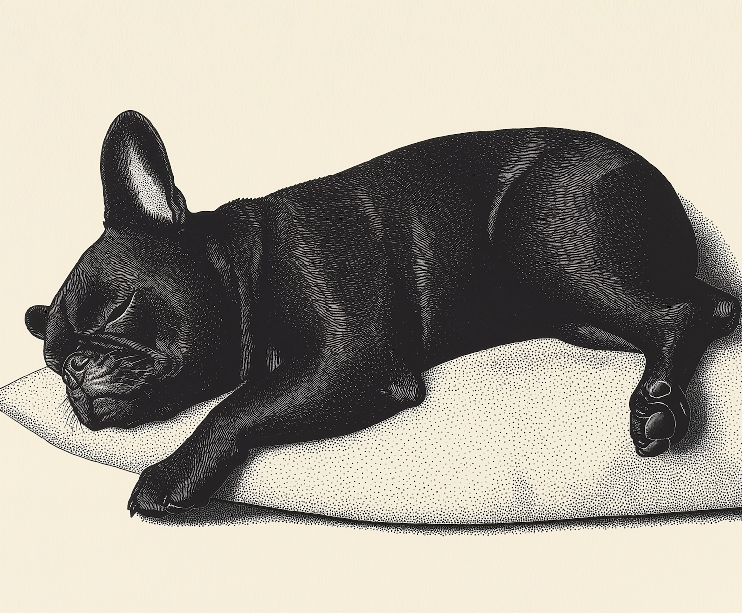 Detailed illustration of a black French Bulldog sleeping on a pillow, with fine etching-style lines and a serene beige background.