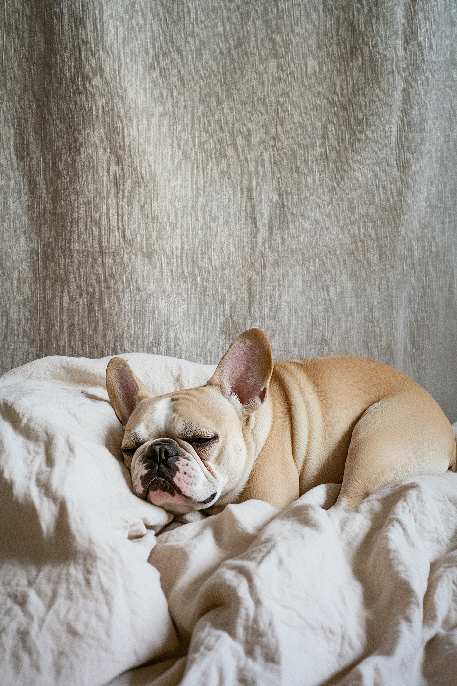 Adorable French Bulldog sleeping on a cozy white bedspread, creating a serene and tranquil atmosphere.