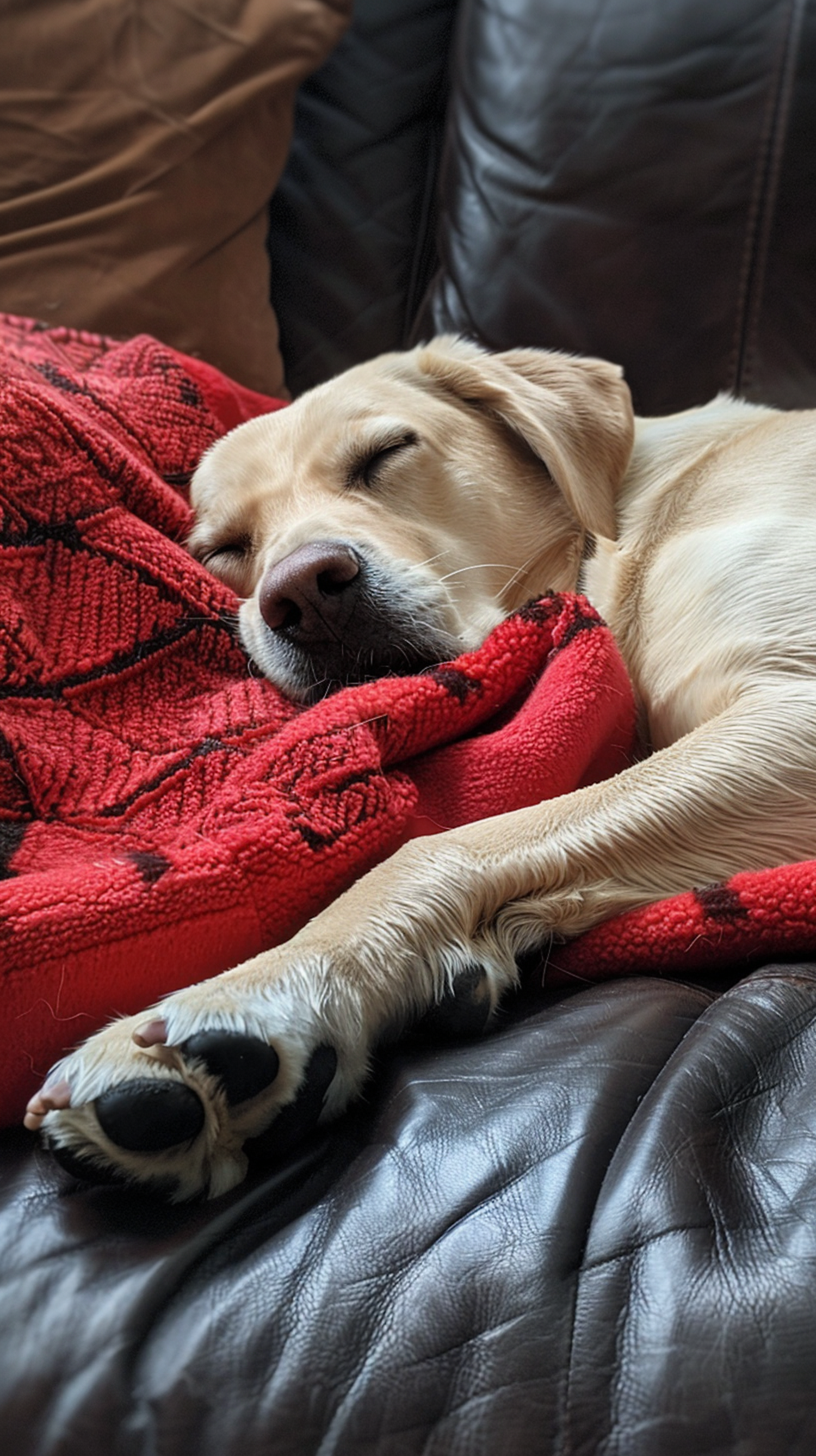 Labrador Retriever sleeping on a leather couch with a red blanket, creating a cozy and peaceful scene.