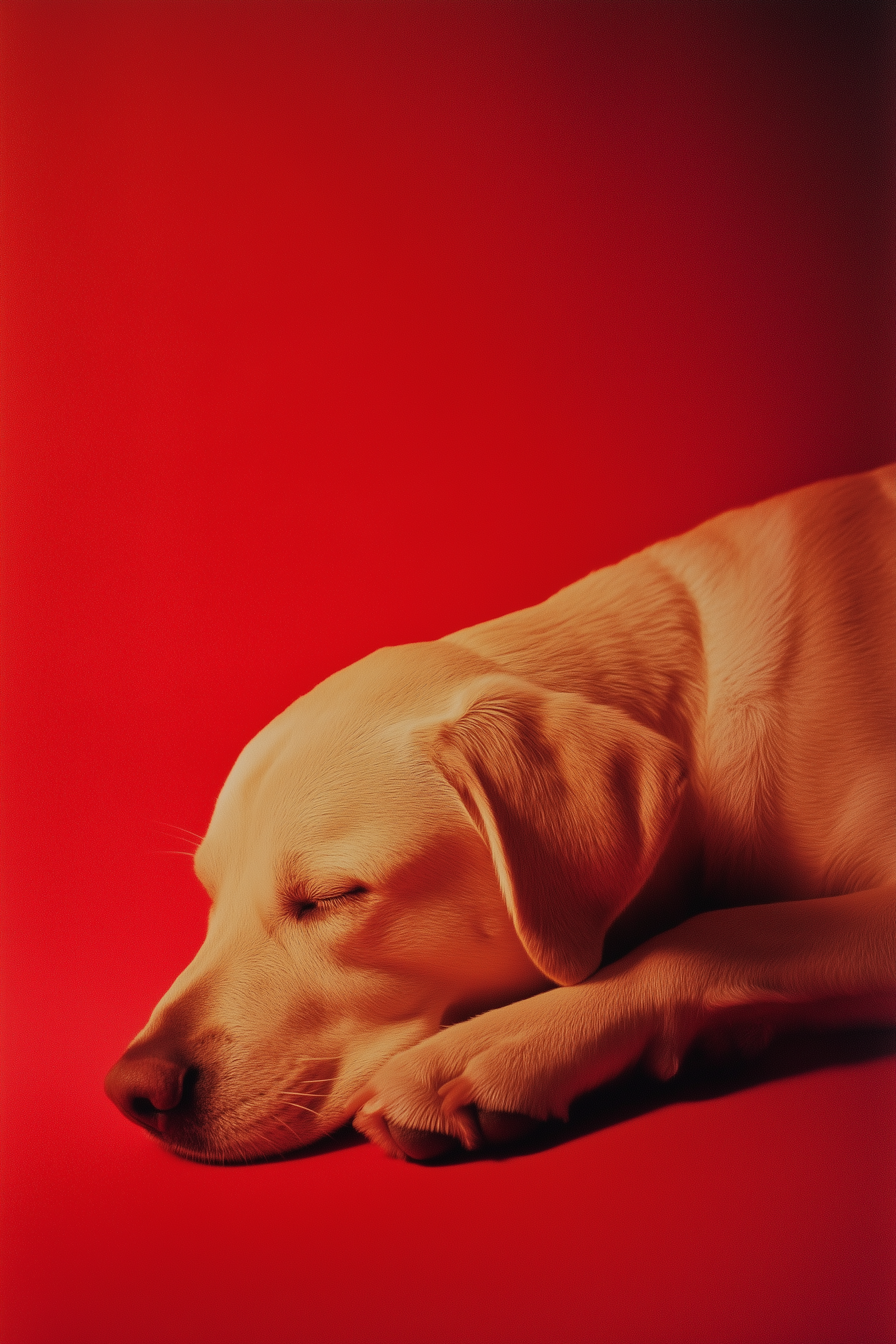 A peaceful Labrador Retriever sleeping on a vibrant red background, showcasing tranquility and warmth.
