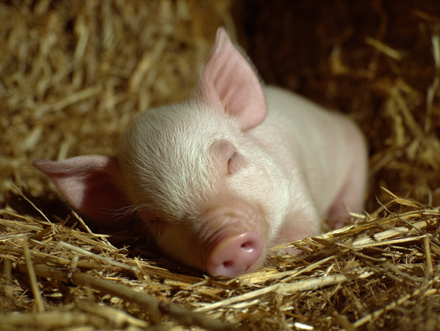 A sleeping piglet nestled in straw, showcasing its peaceful pose and highlighting the warm tones of its straw bedding.
