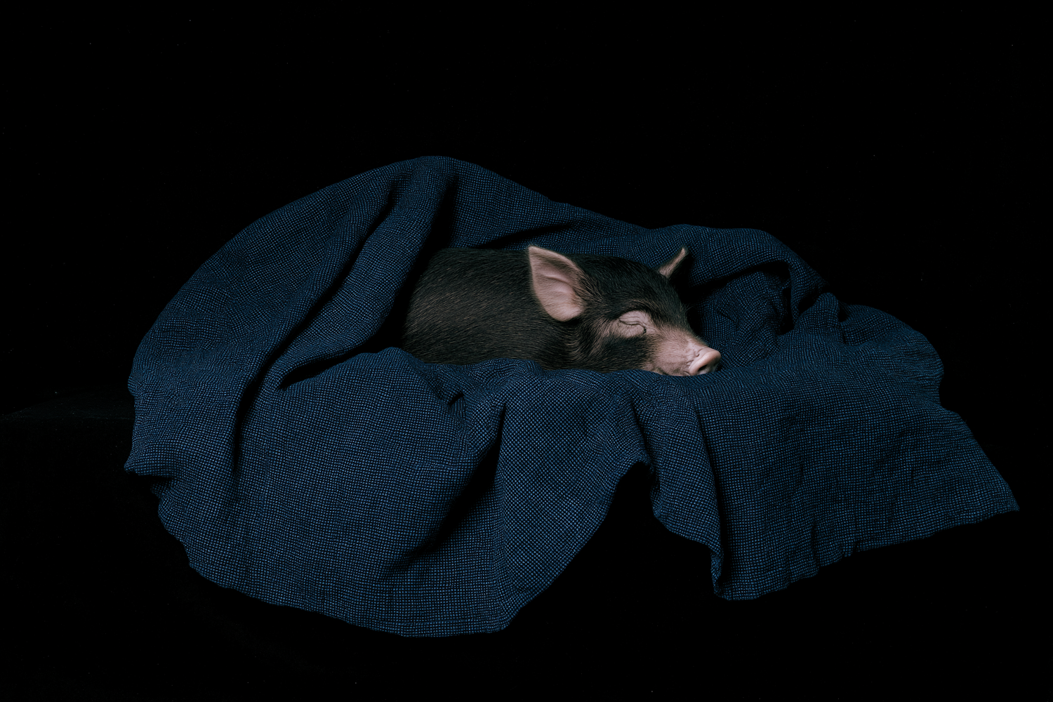 A cozy black piglet wrapped in a navy blue blanket, peacefully resting in this calming and endearing portrait.