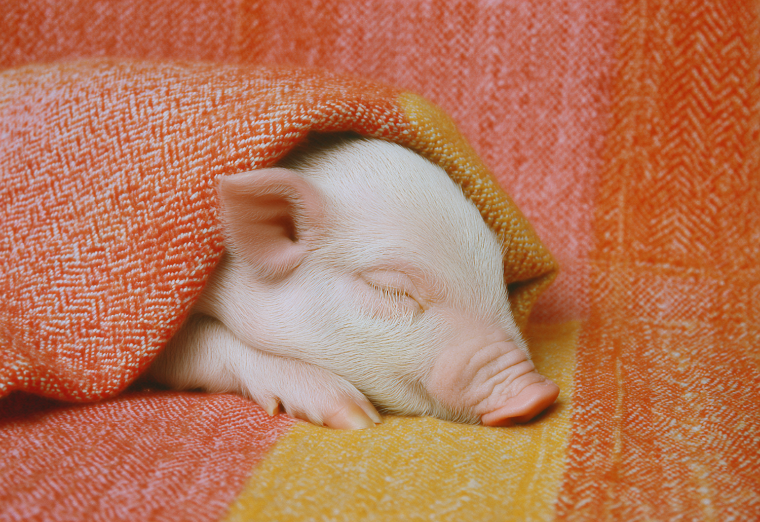 A cute piglet resting under a cozy orange blanket, peacefully sleeping and showcasing calm and comfort.