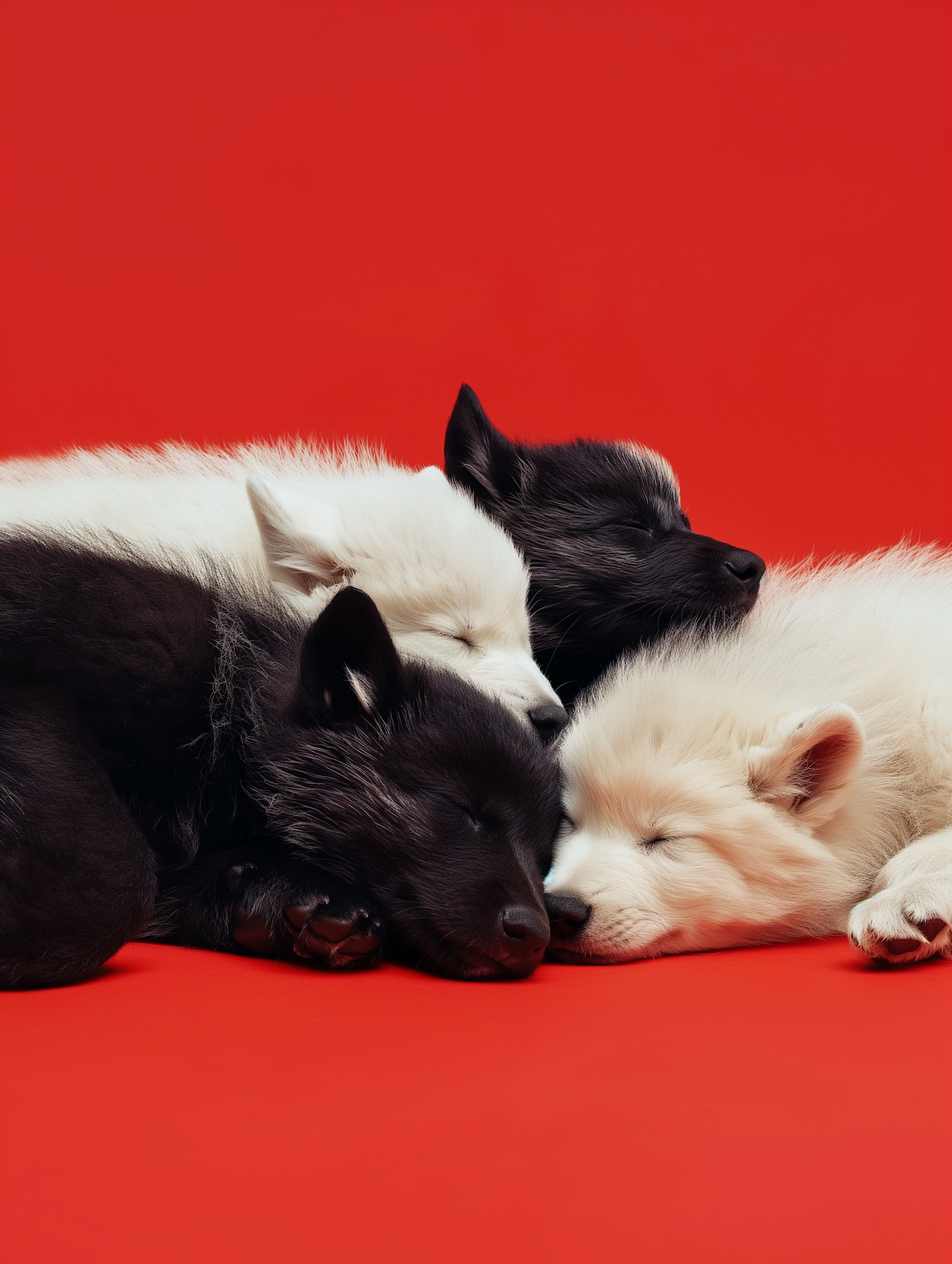 Adorable black and white puppies sleeping on a vibrant red background, creating a cozy and striking visual contrast.