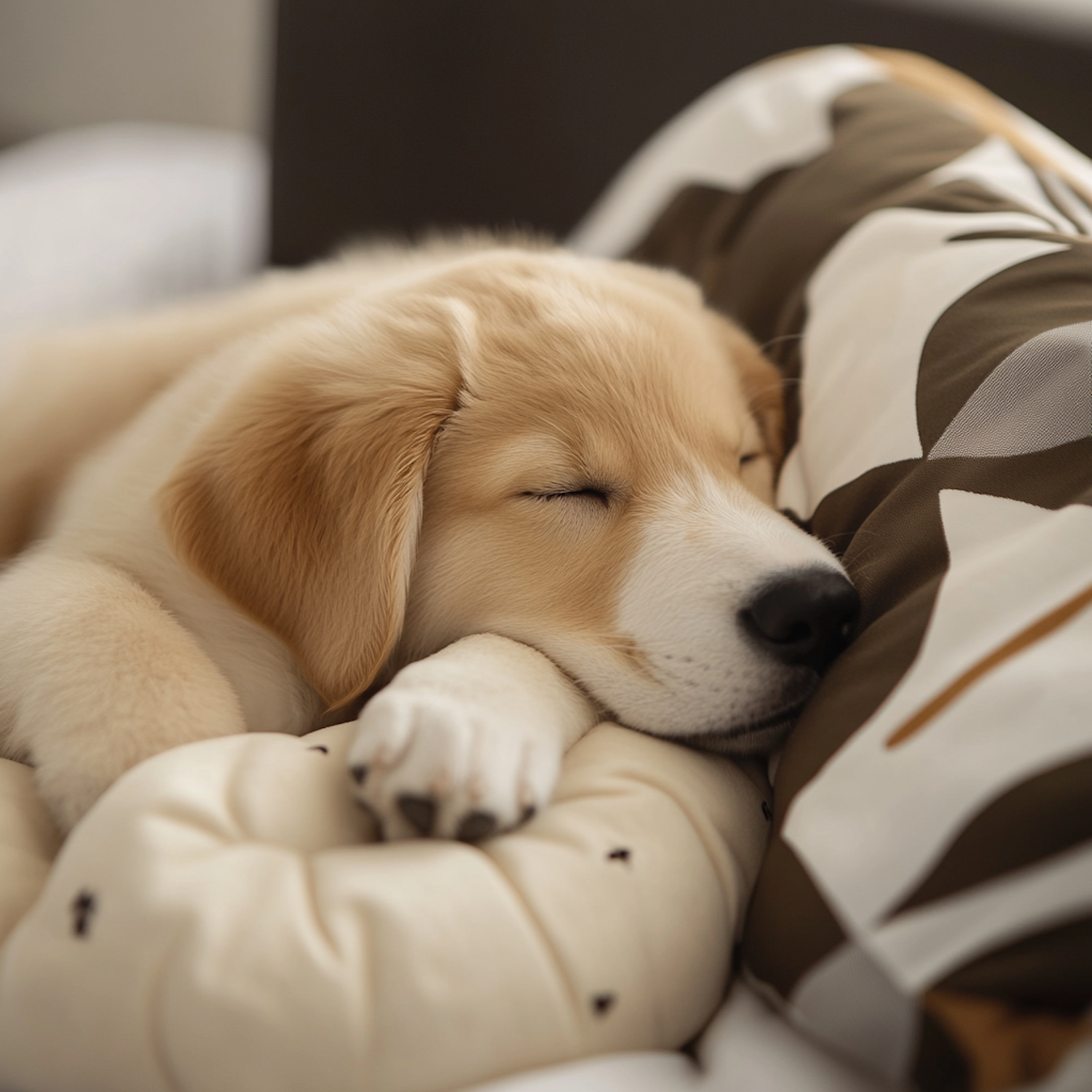 Adorable golden retriever puppy sleeping peacefully on a cozy bed with patterned pillows.