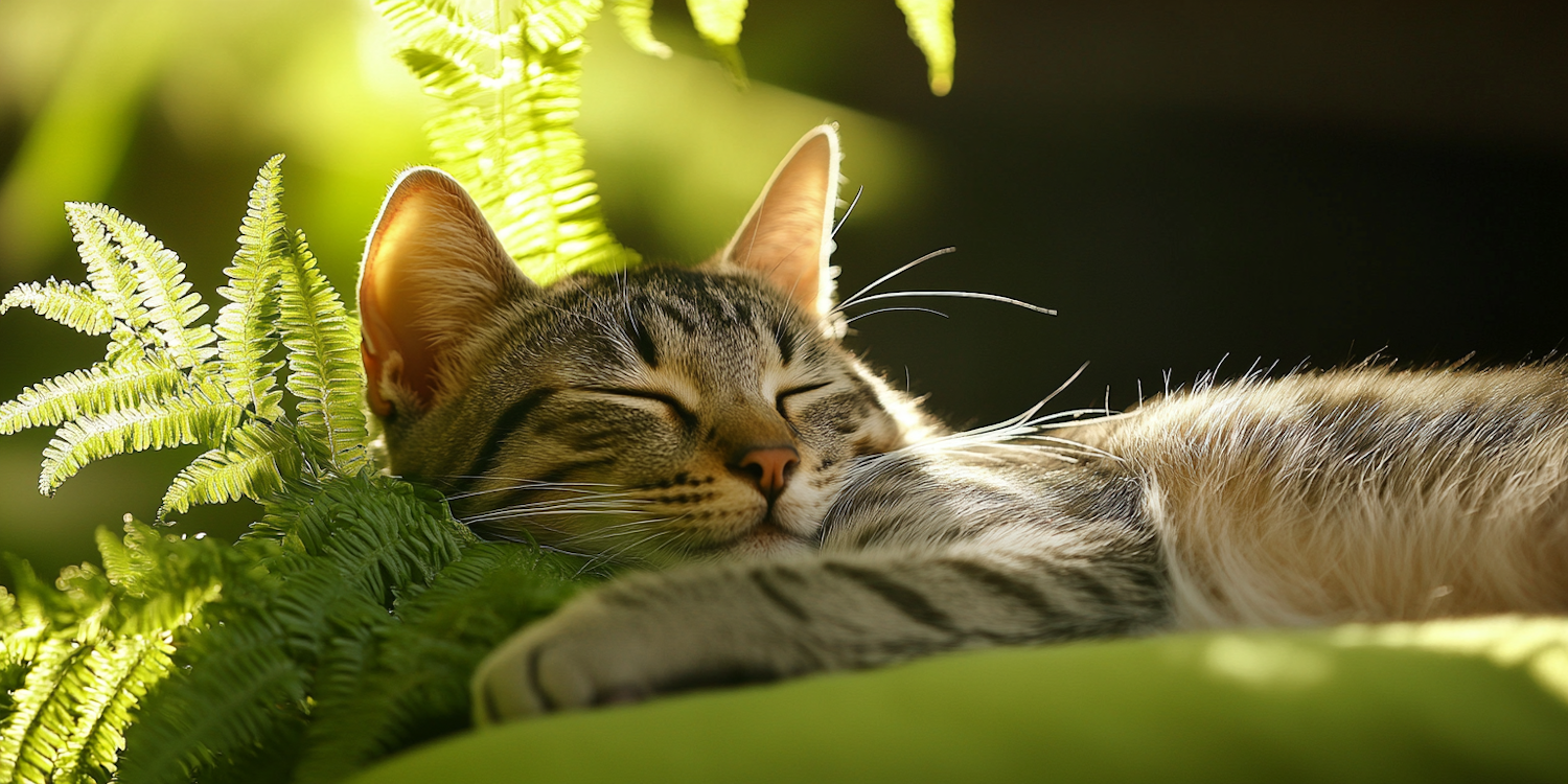 A tabby cat peacefully sleeps among vibrant green ferns, bathed in warm sunlight, creating a serene and tranquil scene.