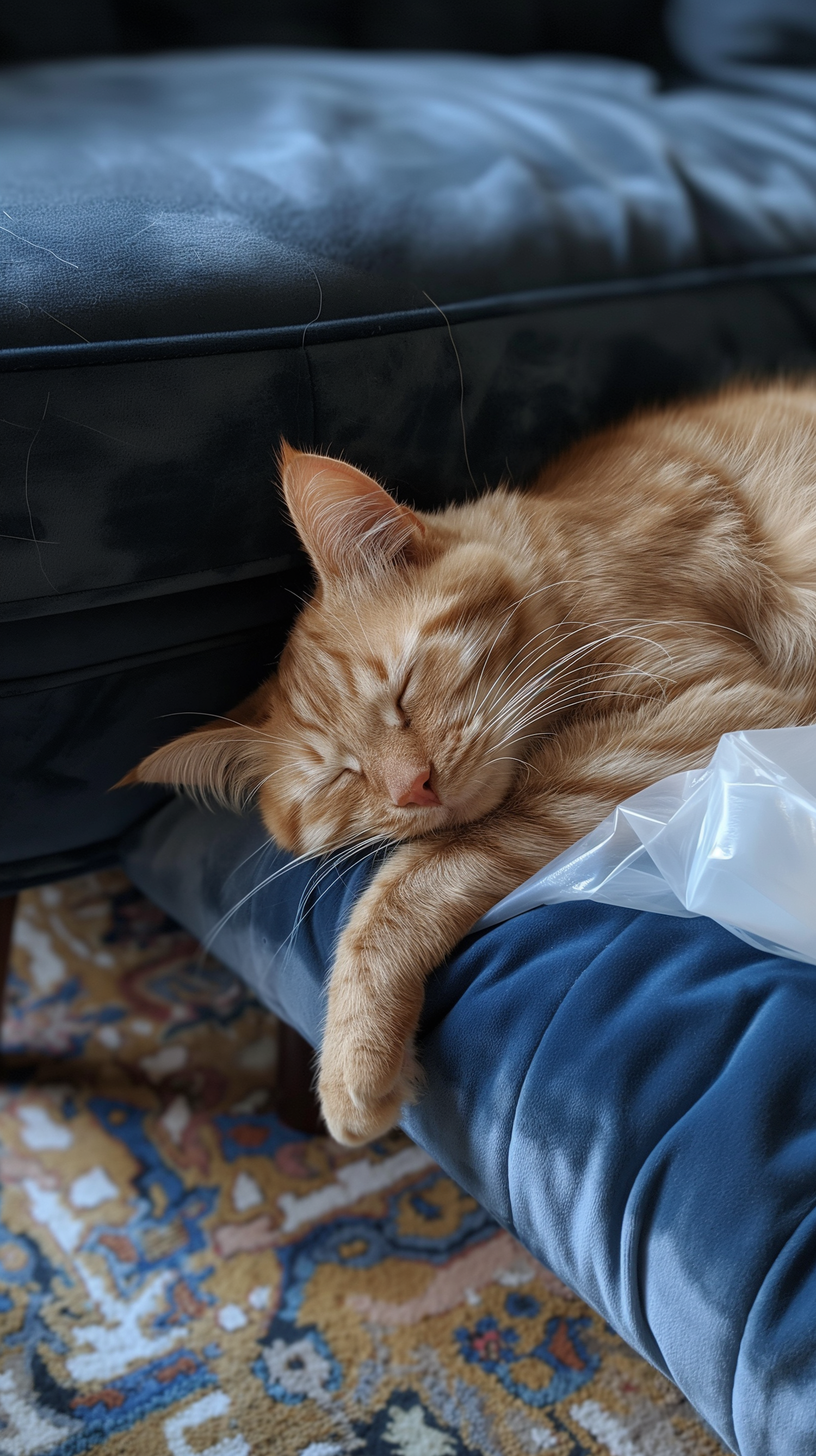 Ginger cat sleeping on a dark blue cushion with a patterned carpet background, exuding warmth and coziness.