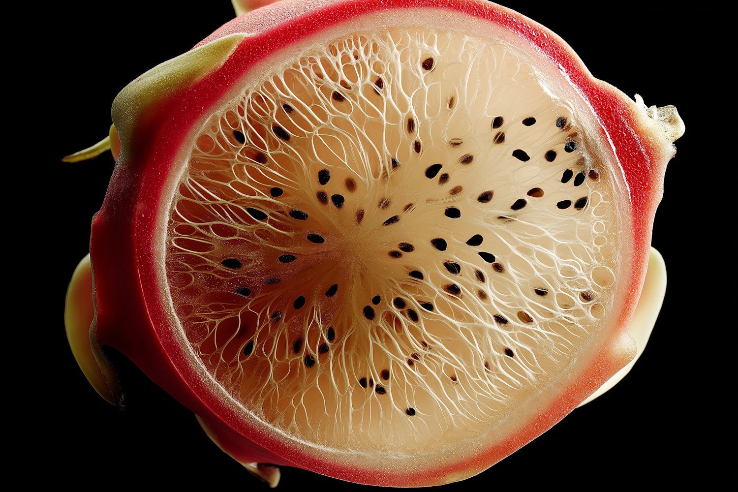 Close-up of a sliced dragon fruit with vibrant red skin, creamy white flesh, and black seeds, set against a black background.