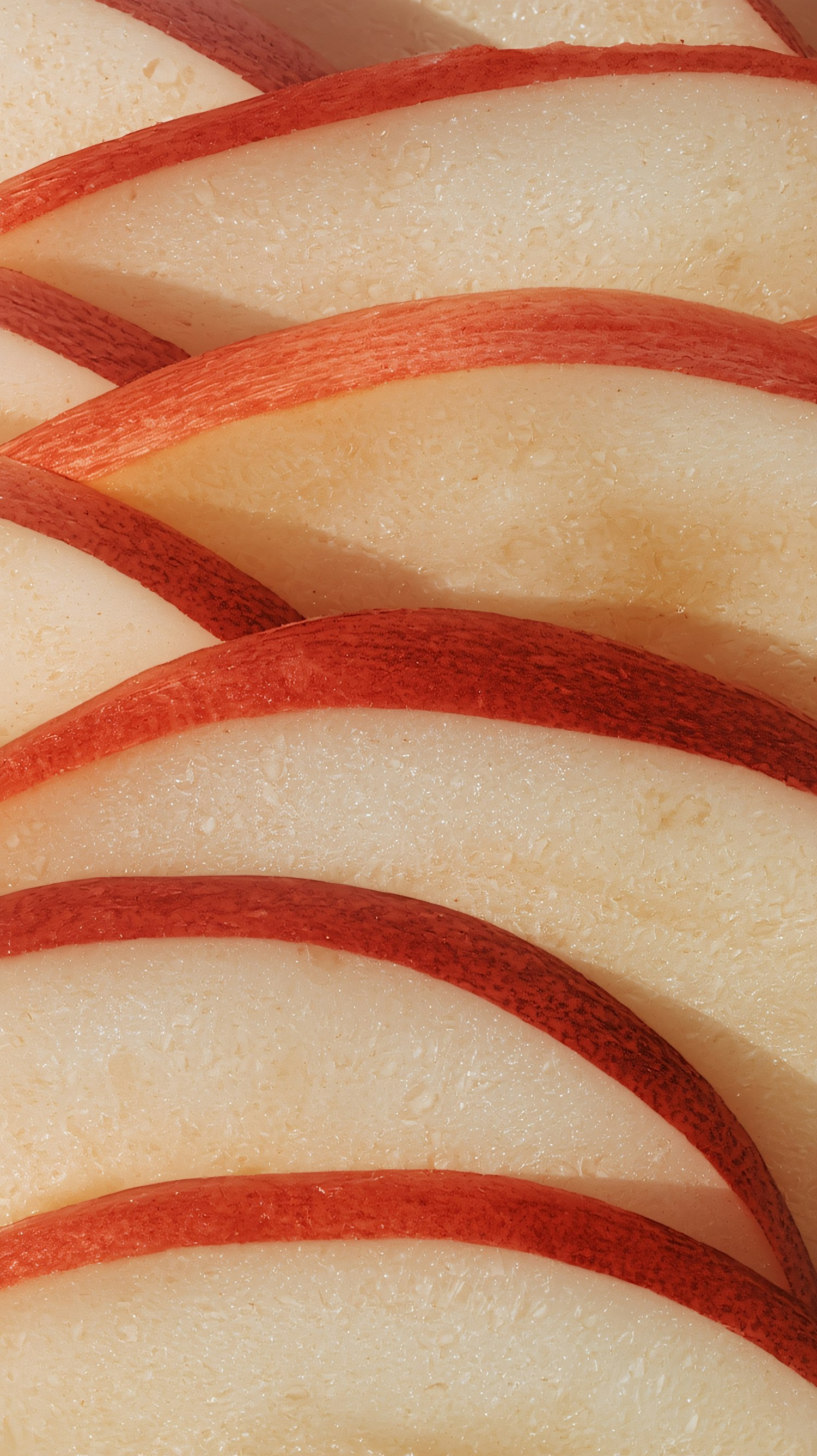 Close-up of thinly sliced pear pieces with vibrant red skin and creamy white flesh, arranged in an overlapping pattern.
