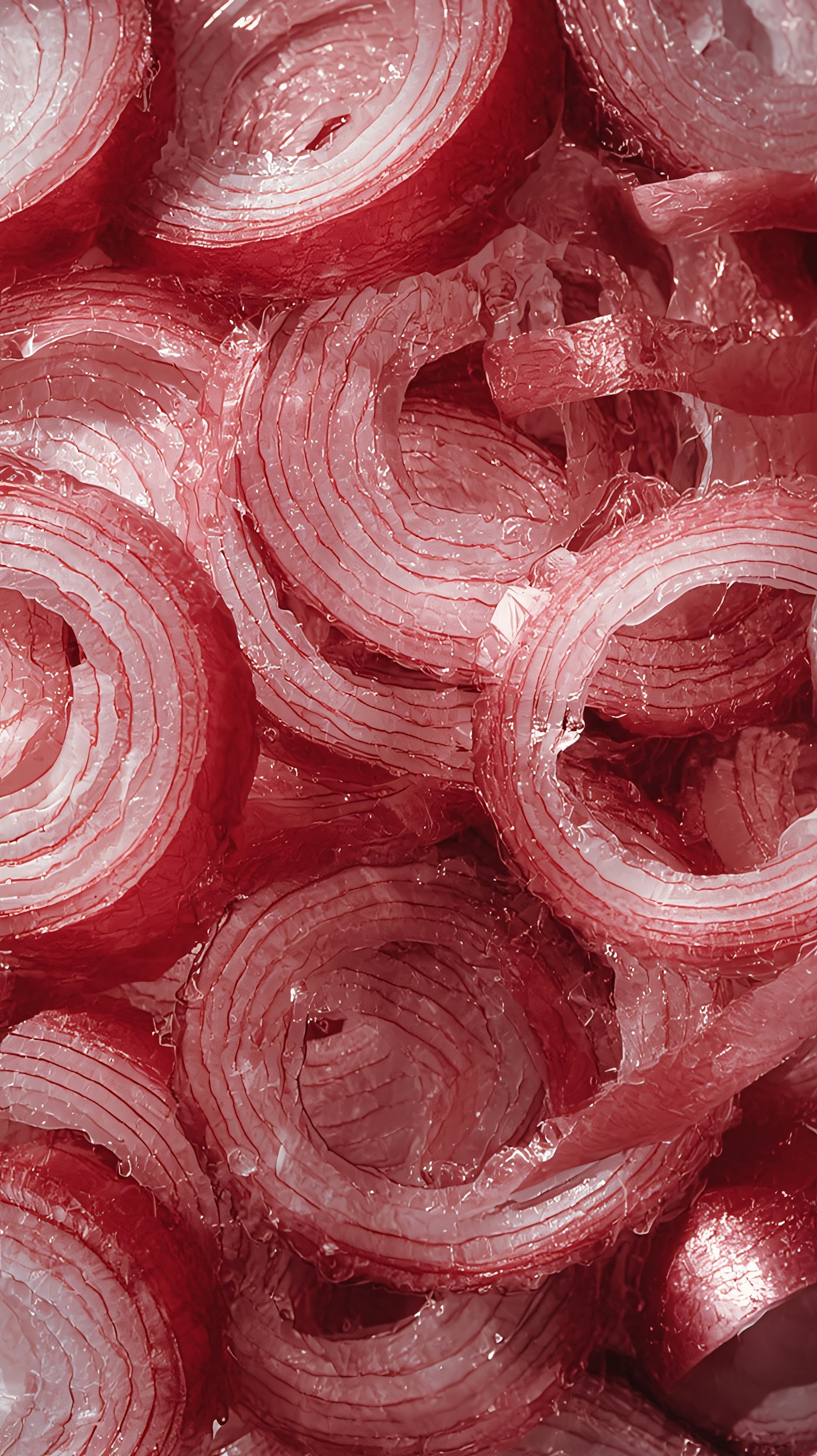 Close-up of thinly sliced red onions, showcasing their vibrant red and white rings and glossy, fresh texture.