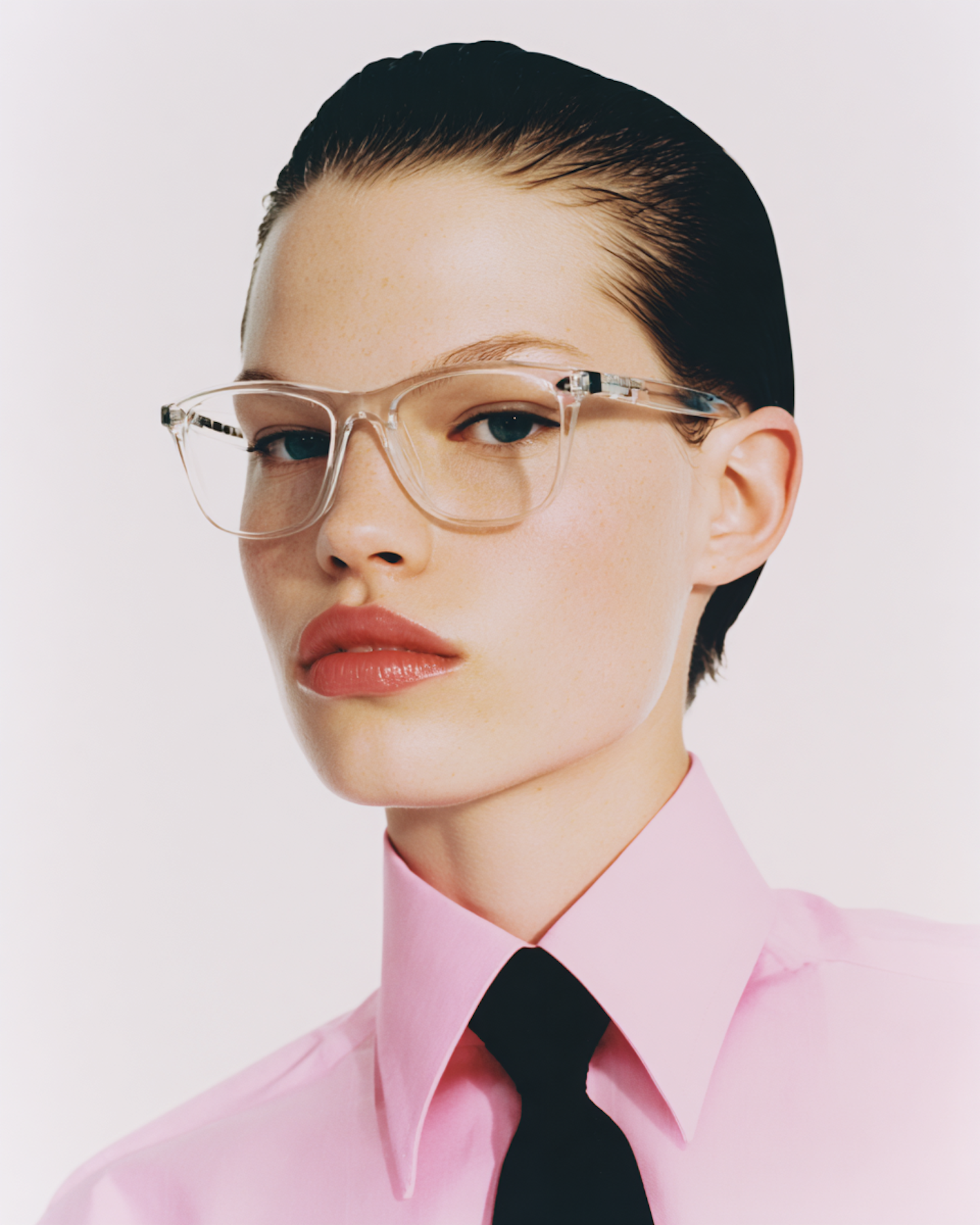 Close-up of a person wearing transparent-framed glasses, a pink shirt, and a black tie, with slicked-back hair.