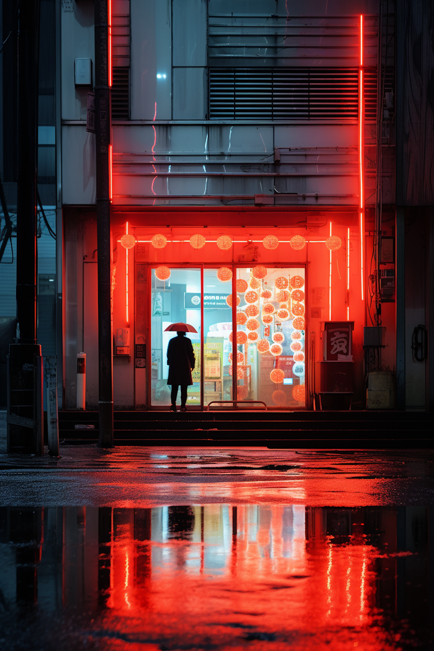 A lone figure with a red umbrella stands before a neon-lit storefront at night, reflecting vibrant red hues on wet pavement.