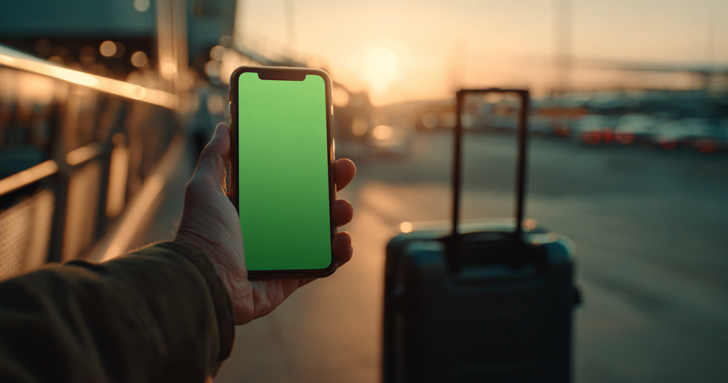 A hand holds a green-screen smartphone near a suitcase at sunset, evoking travel and technology in a serene outdoor setting.