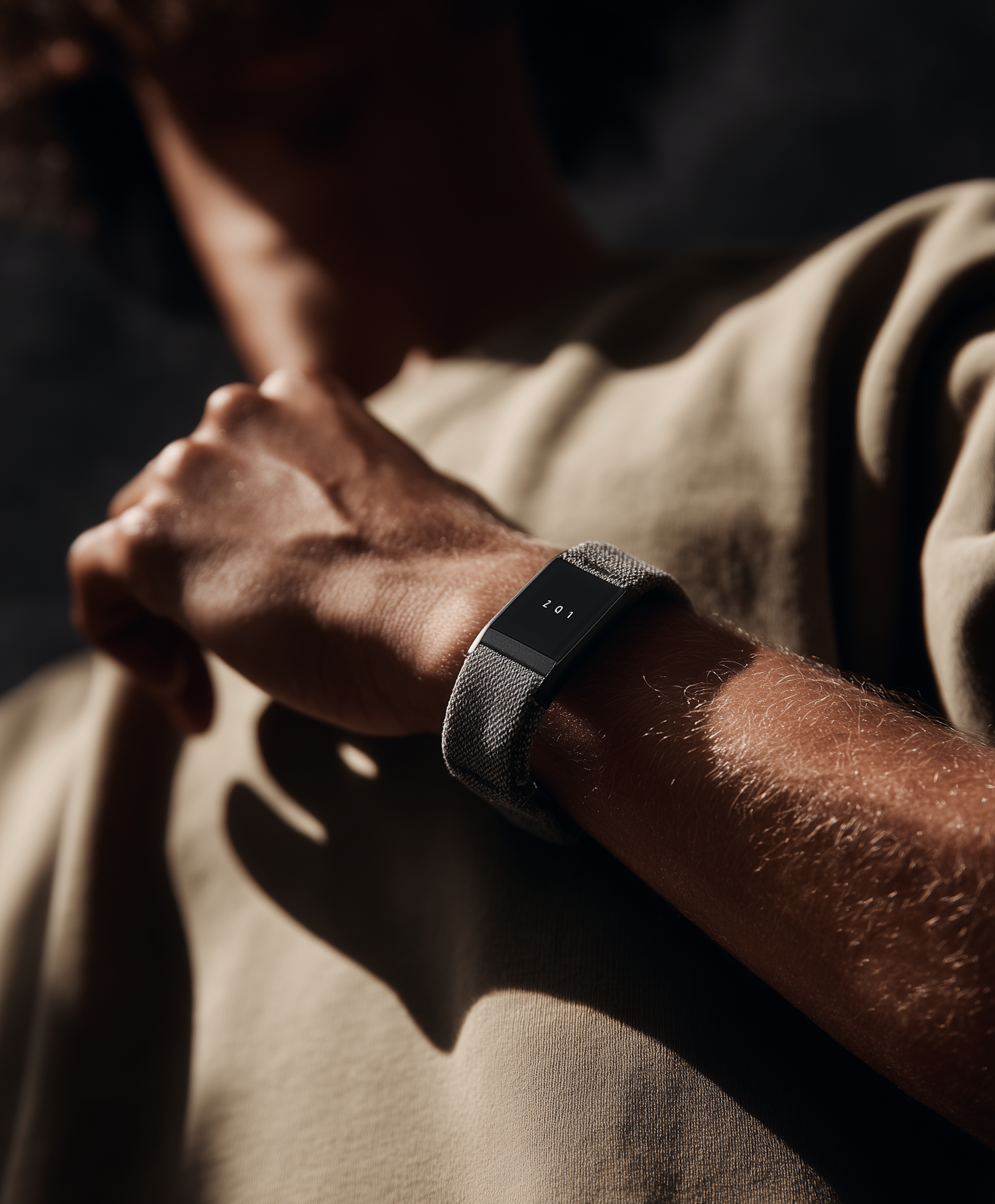 Close-up of a wrist wearing a sleek smartwatch with a fabric strap, displaying '2:01'. Dramatic lighting highlights the watch and arm details.