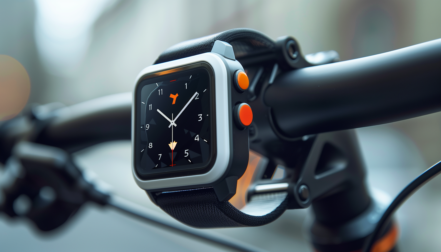Smartwatch with orange buttons mounted on a bicycle handlebar, featuring an analog clock face and sleek design.