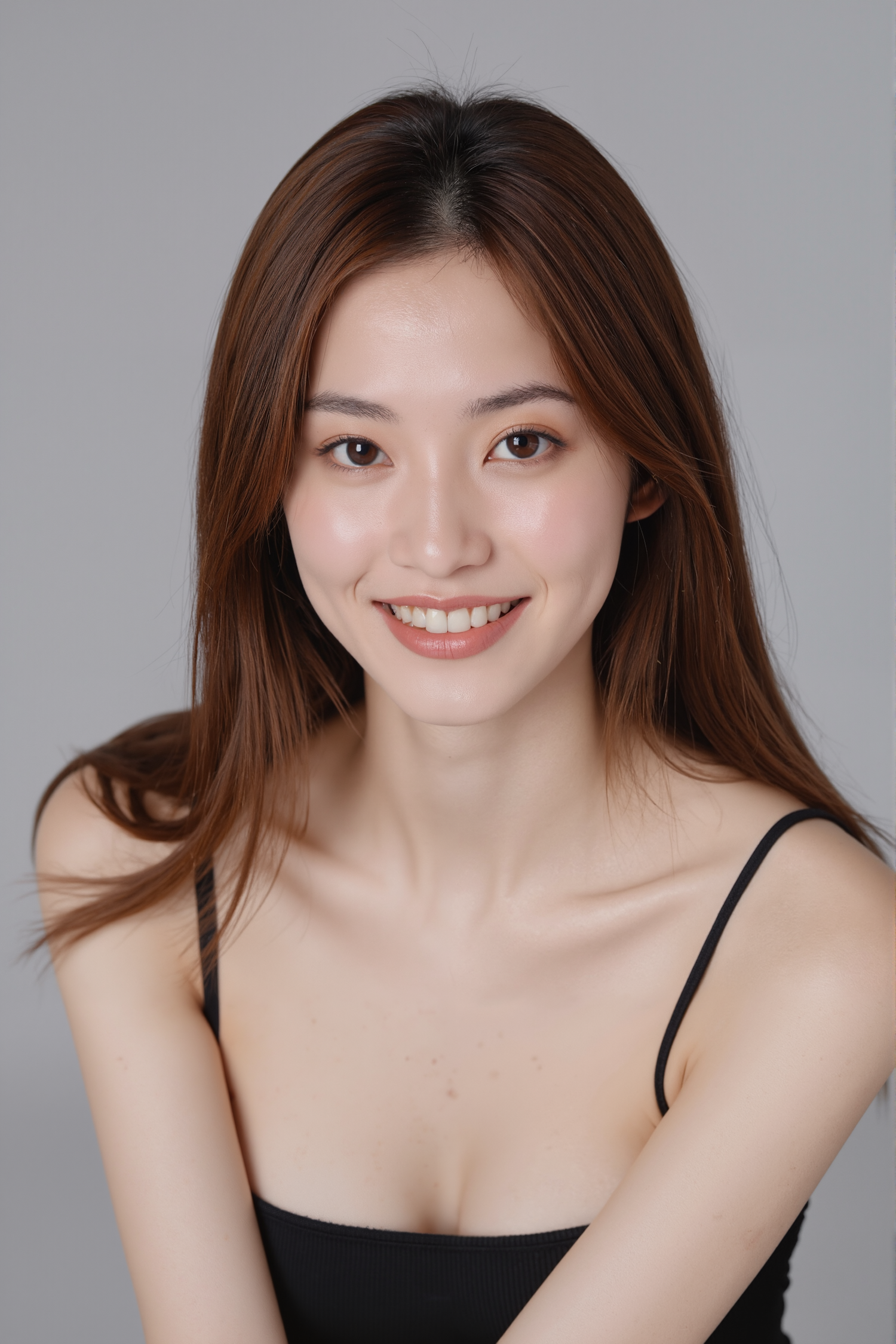 A young woman with long brown hair and a warm smile, wearing a black spaghetti-strap top against a light gray background.