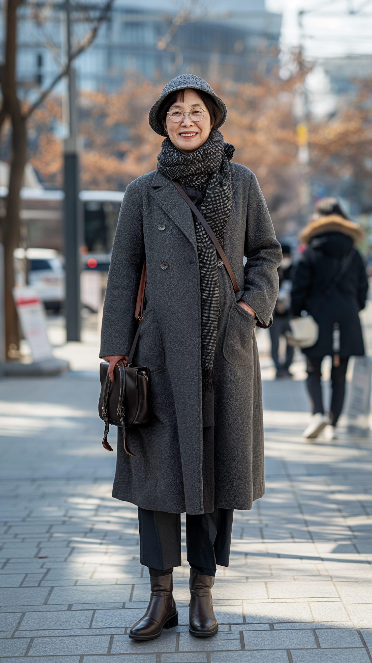 Asian woman in gray coat and hat smiling on a city street, holding a leather bag. Urban winter fashion scene.