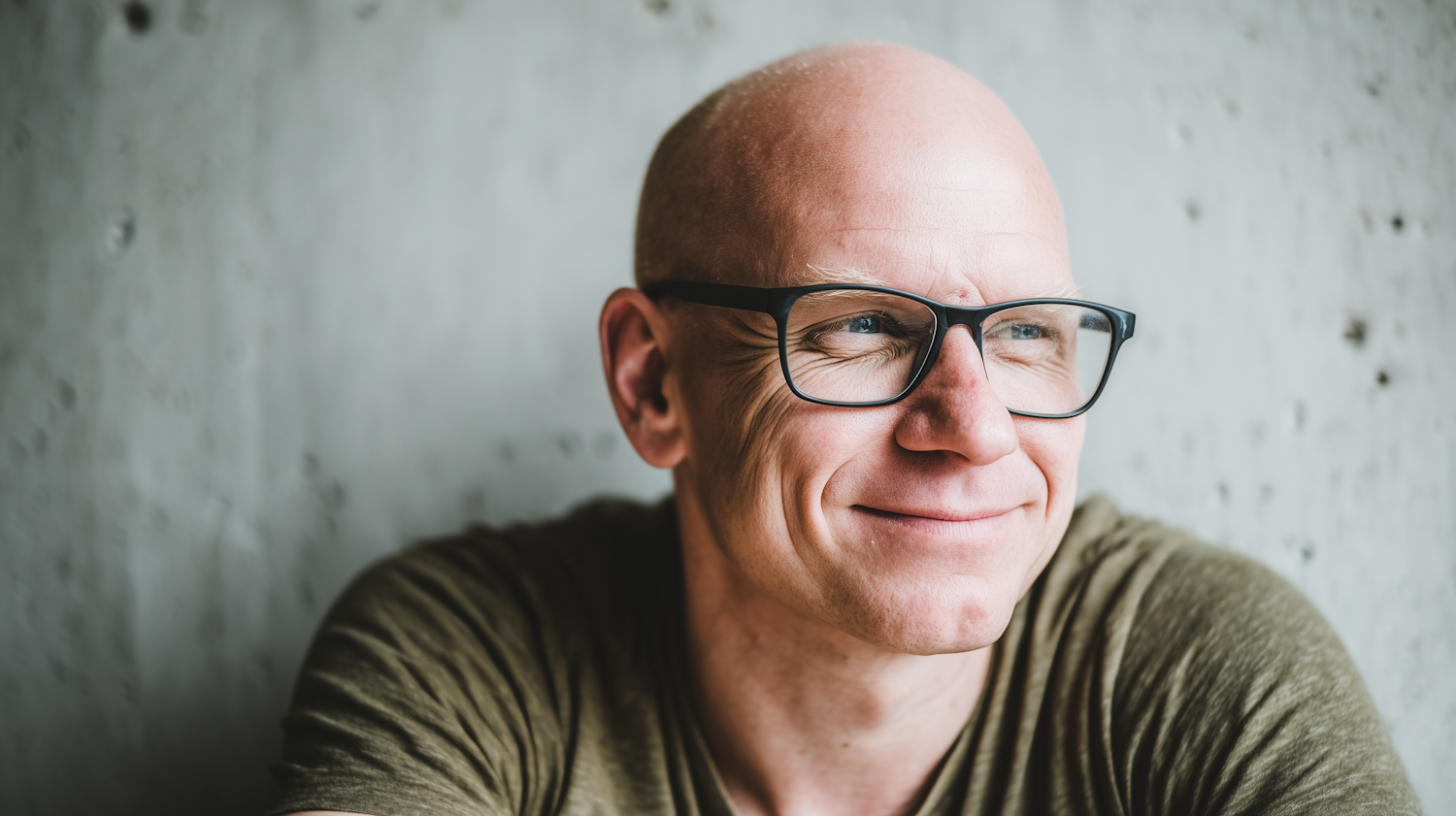 A bald man with glasses and a green shirt smiles slightly, looking to the side against a textured light wall.
