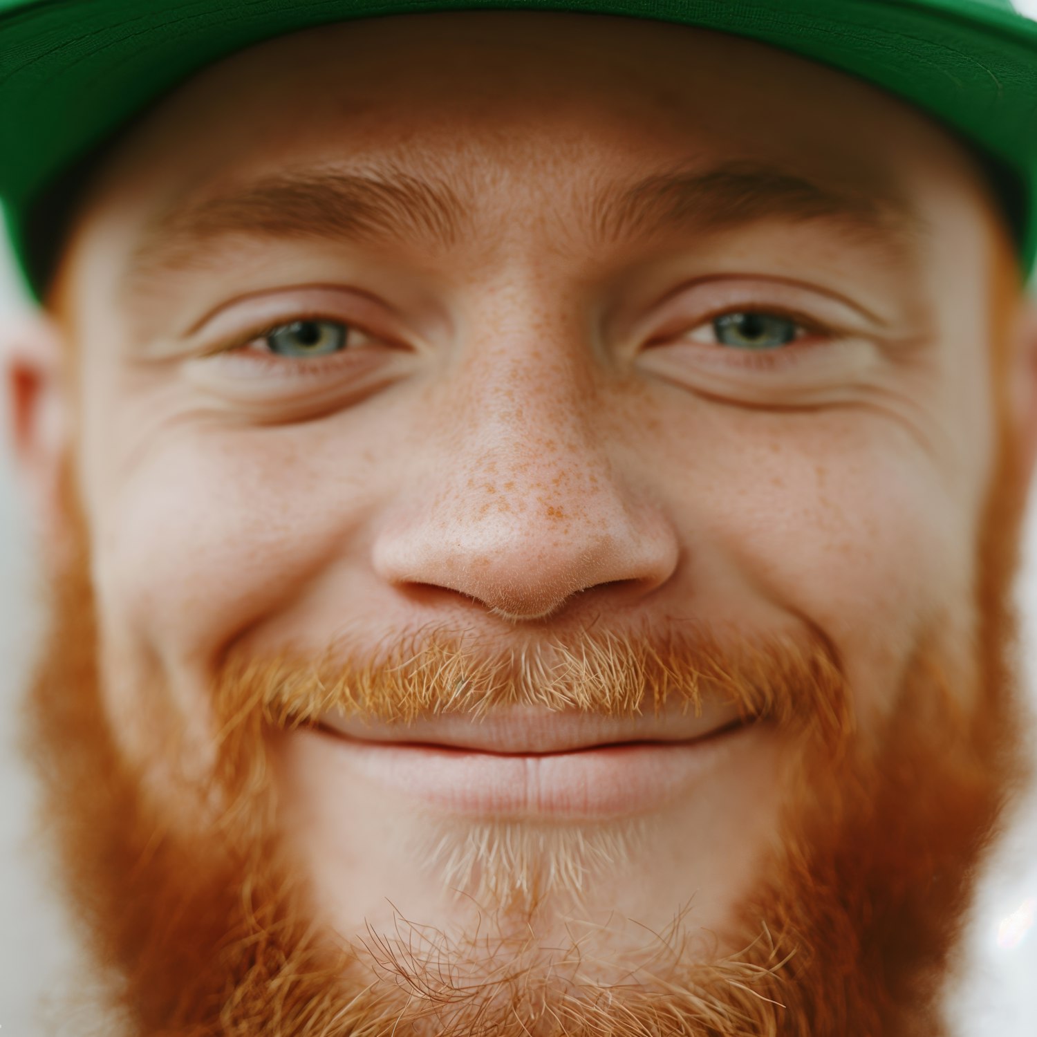Close-up of a smiling man with a red beard, freckles, and a green cap, radiating warmth and cheerfulness.