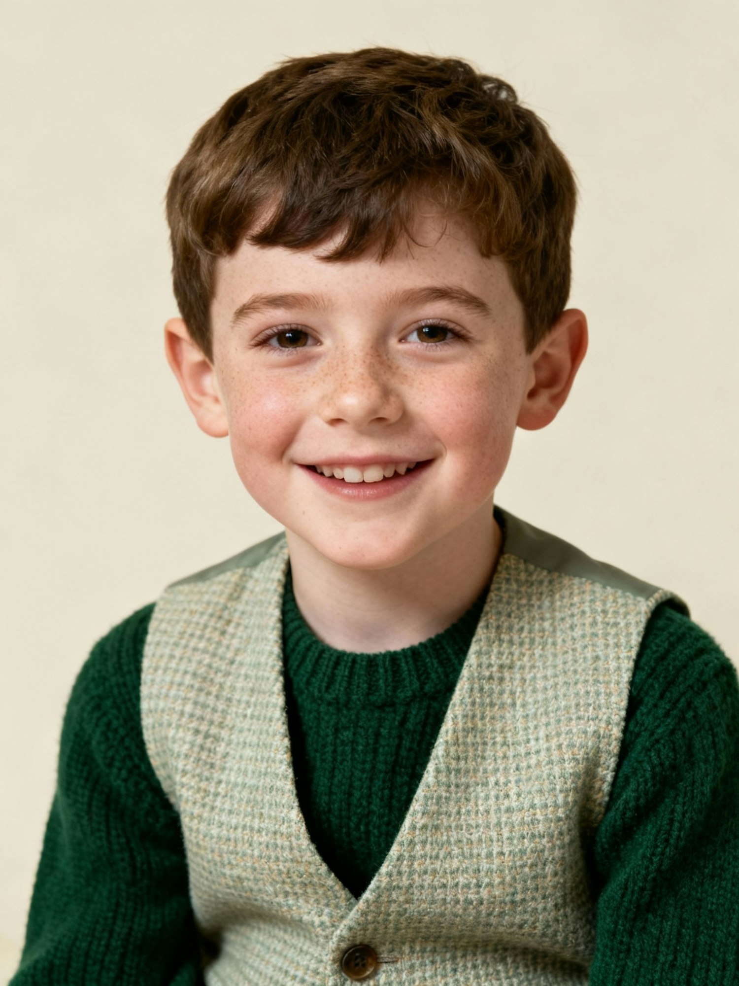 A cheerful young boy with brown hair and freckles, wearing a green sweater and beige vest, smiles warmly against a neutral background.