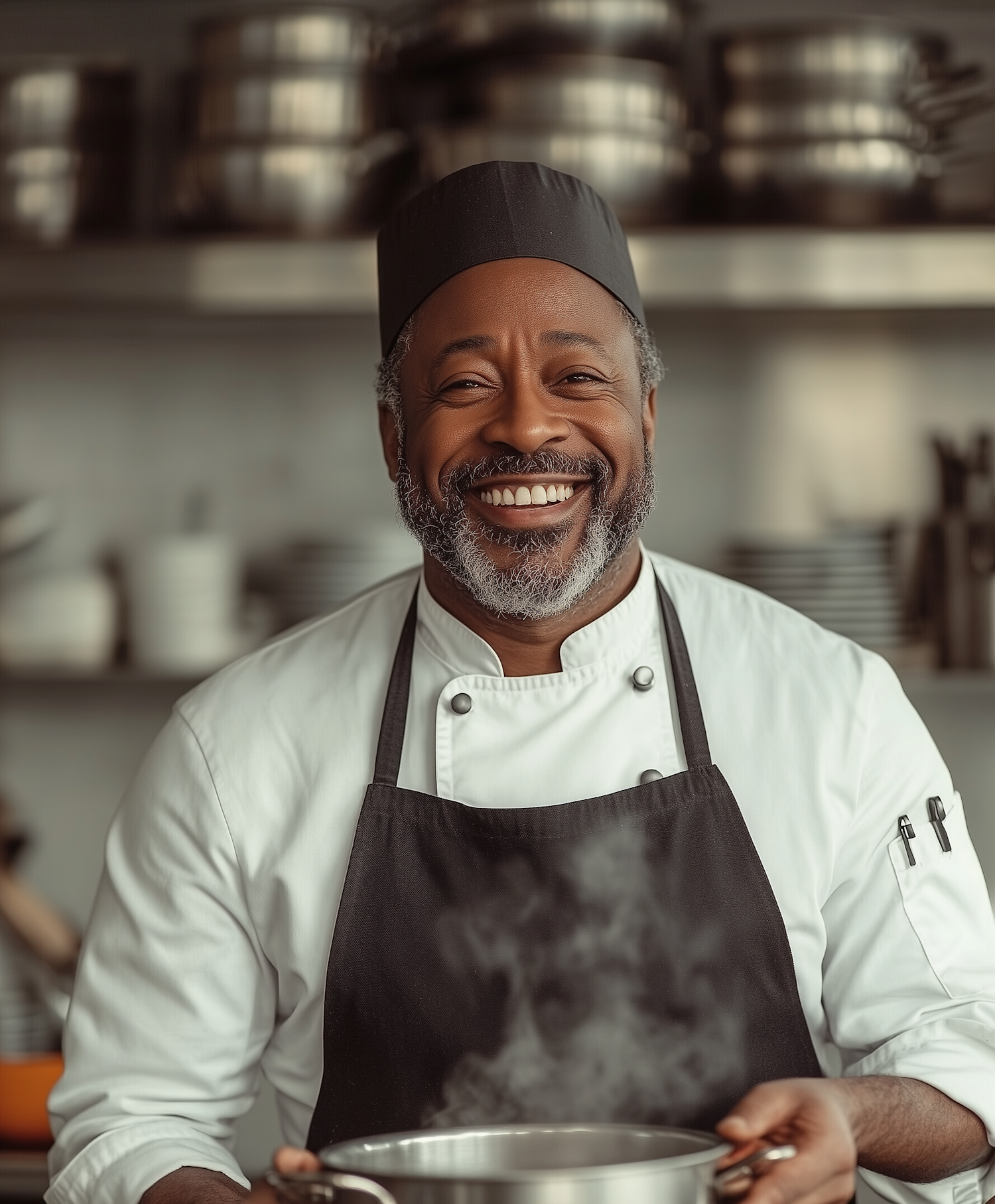 Smiling Black chef in a professional kitchen holding a steaming pot, wearing a white coat and black apron, surrounded by cookware.