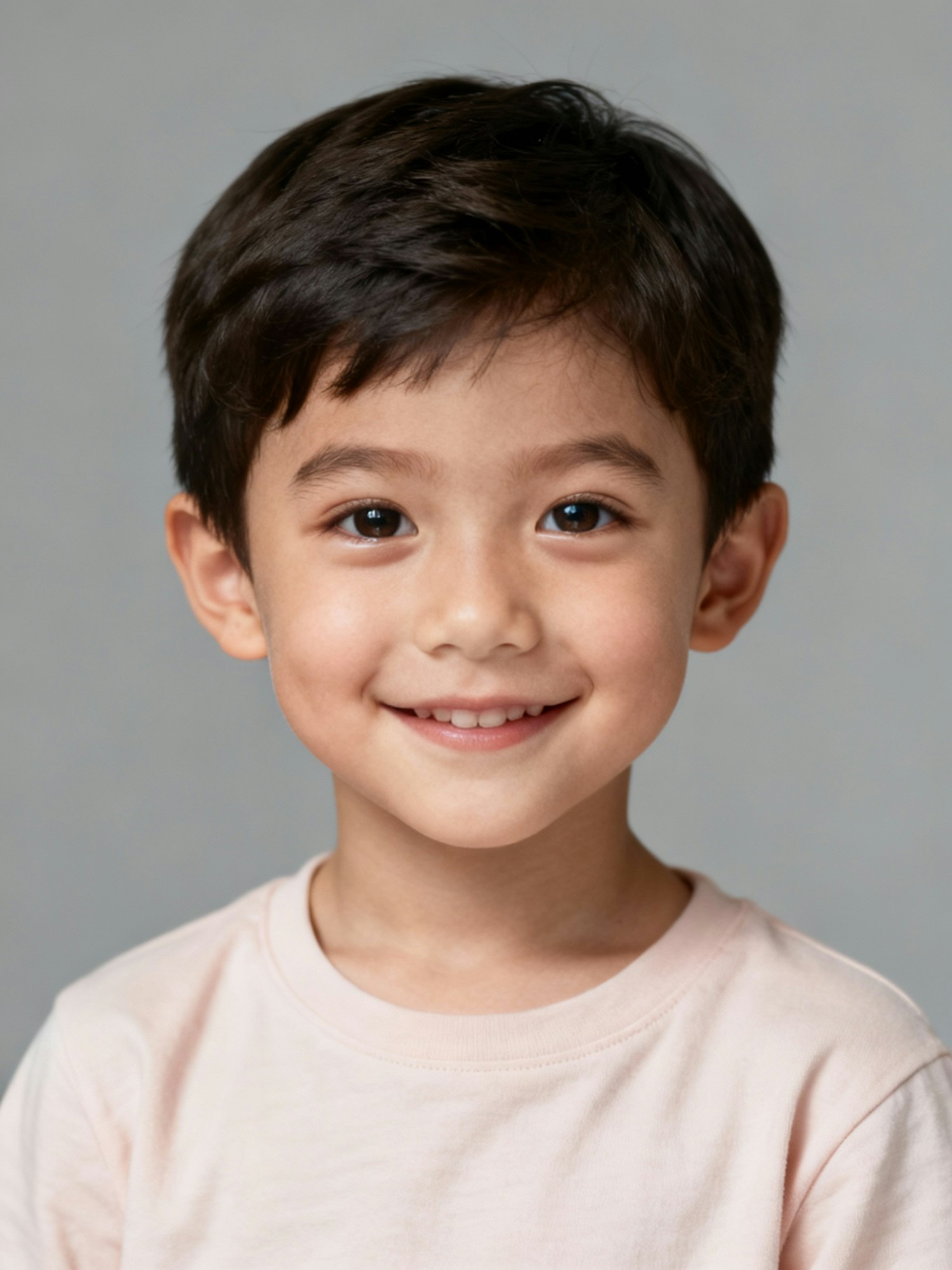 Editorial studio portrait of a child, around 6 years old; joyful and calm expression, eyes bright and natural; clean, cohesive style for a global portrait series. Lighting: clamshell setup with soft key and gentle rim, balanced at 5500 K for even skin tone; soft reflection on eyes for a natural glow. Backdrop: neutral seamless (mid-gray with subtle vignette). Lens: 105 mm macro-sharp detail; photorealistic, editorial quality. Skin: natural, healthy, softly lit — no over-retouch, no artificial blur. Clothing: simple, non-branded, soft neutral or pastel tones. Framing: waist-up, centered, eye-level. Expression: genuine joy, calm confidence. Negative: harsh shadows, filters, brand logos, watermark, exaggerated features, overly stylized lighting.