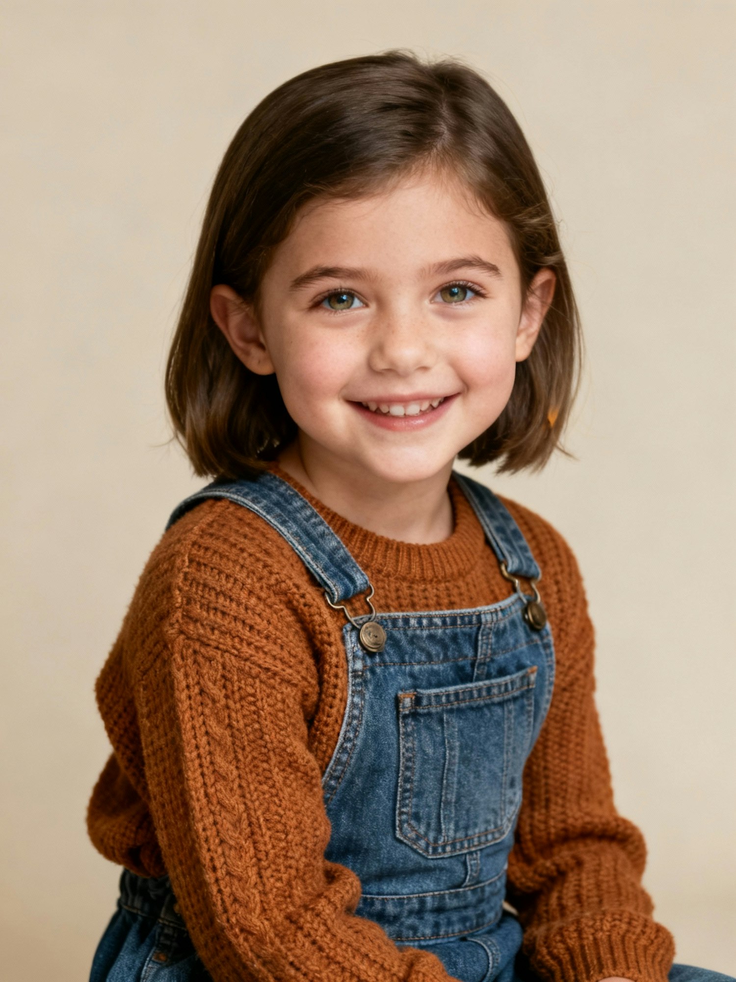 Editorial studio portrait of an American child, ~6-year-old girl; calm, joyful expression; eyes bright and natural; cohesive global portrait series. Lighting: clamshell soft key with gentle rim, daylight balanced at 5500 K; subtle catchlights. Backdrop: light oatmeal-beige seamless with a very soft vignette. Lens: 105 mm macro-sharp; photorealistic, editorial. Skin: fair with neutral undertone. Clothing: caramel knit sweater layered under a classic denim pinafore (autumn vibe). Negative: harsh shadows, filters, brand logos, watermark, exaggerated effects.