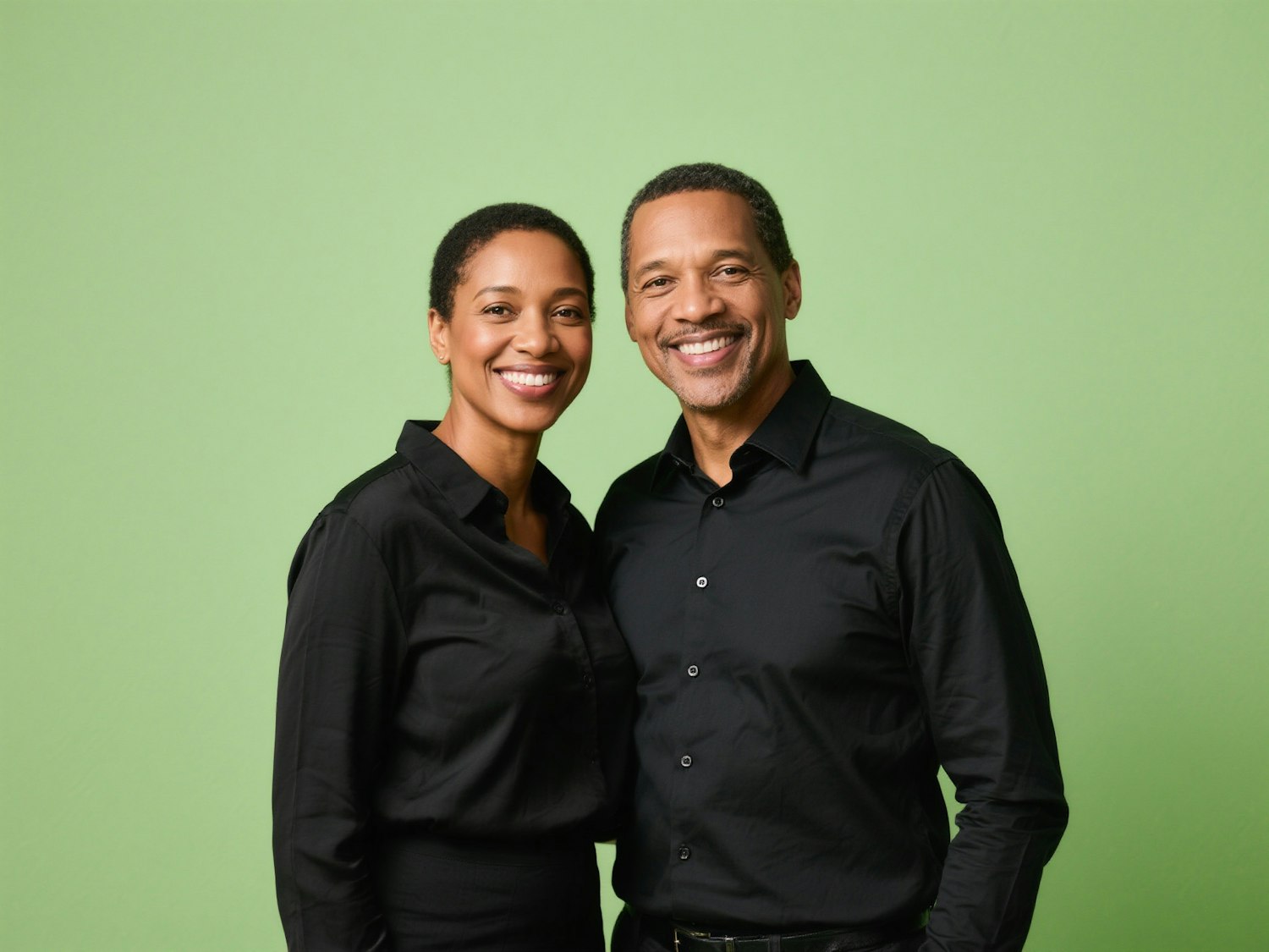 heteroxesual black couple on their 40's smiling wearing black with a medium green background.
