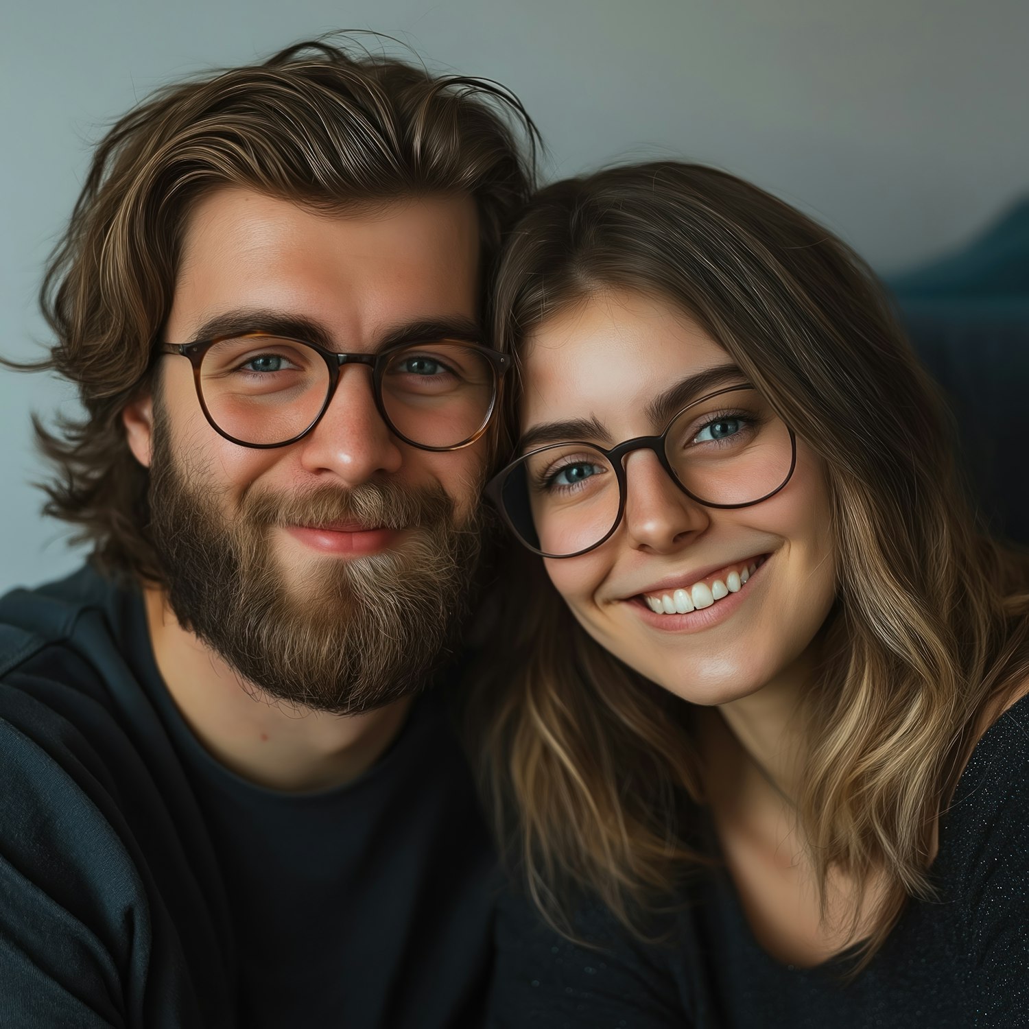 Smiling couple with glasses, close-up portrait. Both have brown hair and wear dark tops, exuding warmth and affection.
