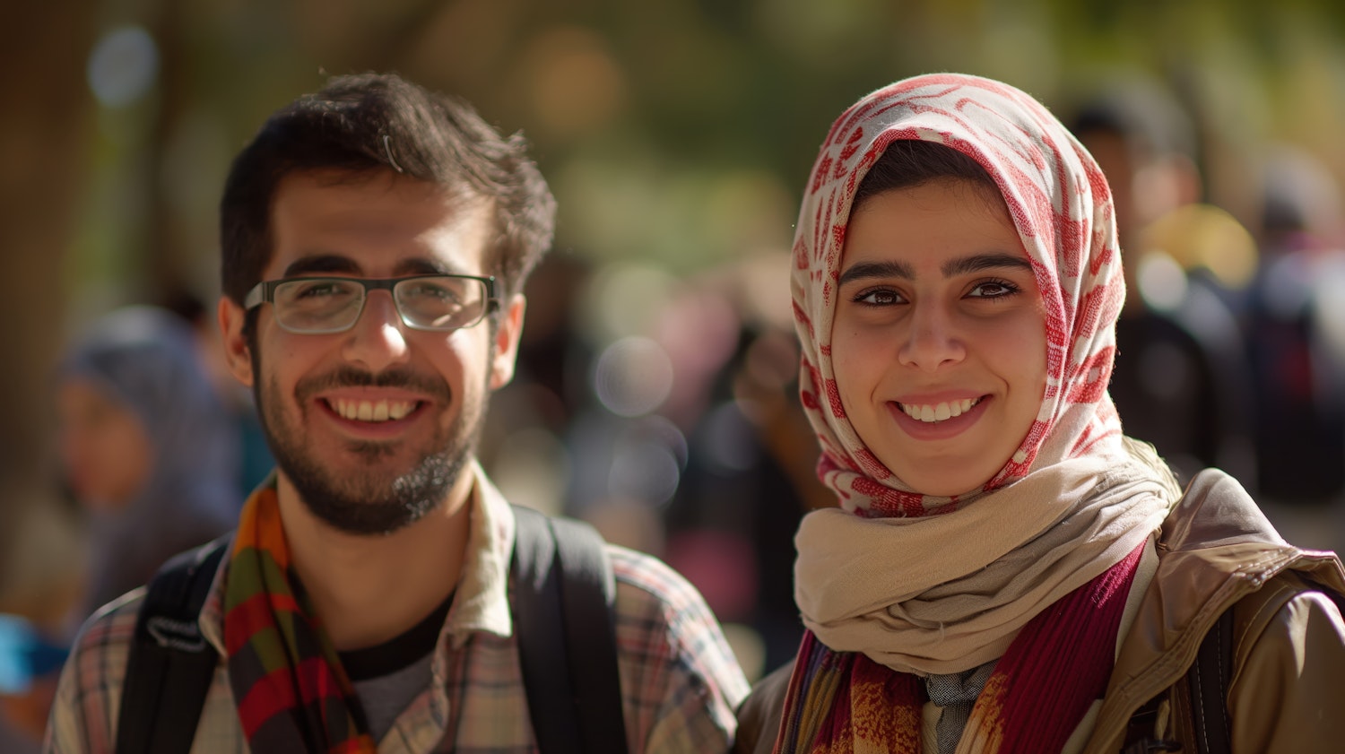 Smiling young man and woman outdoors, wearing a hijab and glasses, with a blurred park background and warm natural lighting.