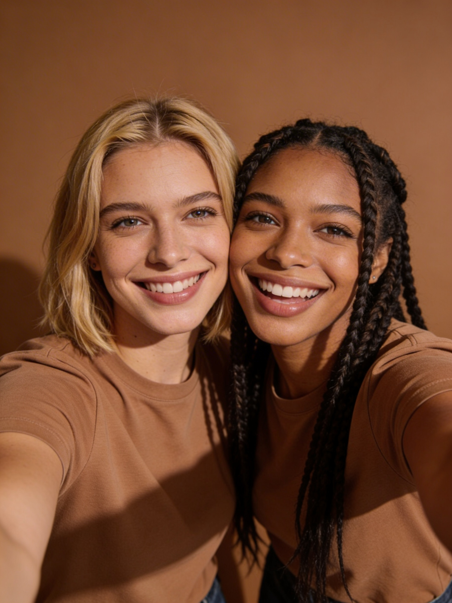 Two friends smiling brightly in matching brown shirts against a warm brown background, radiating joy and connection.