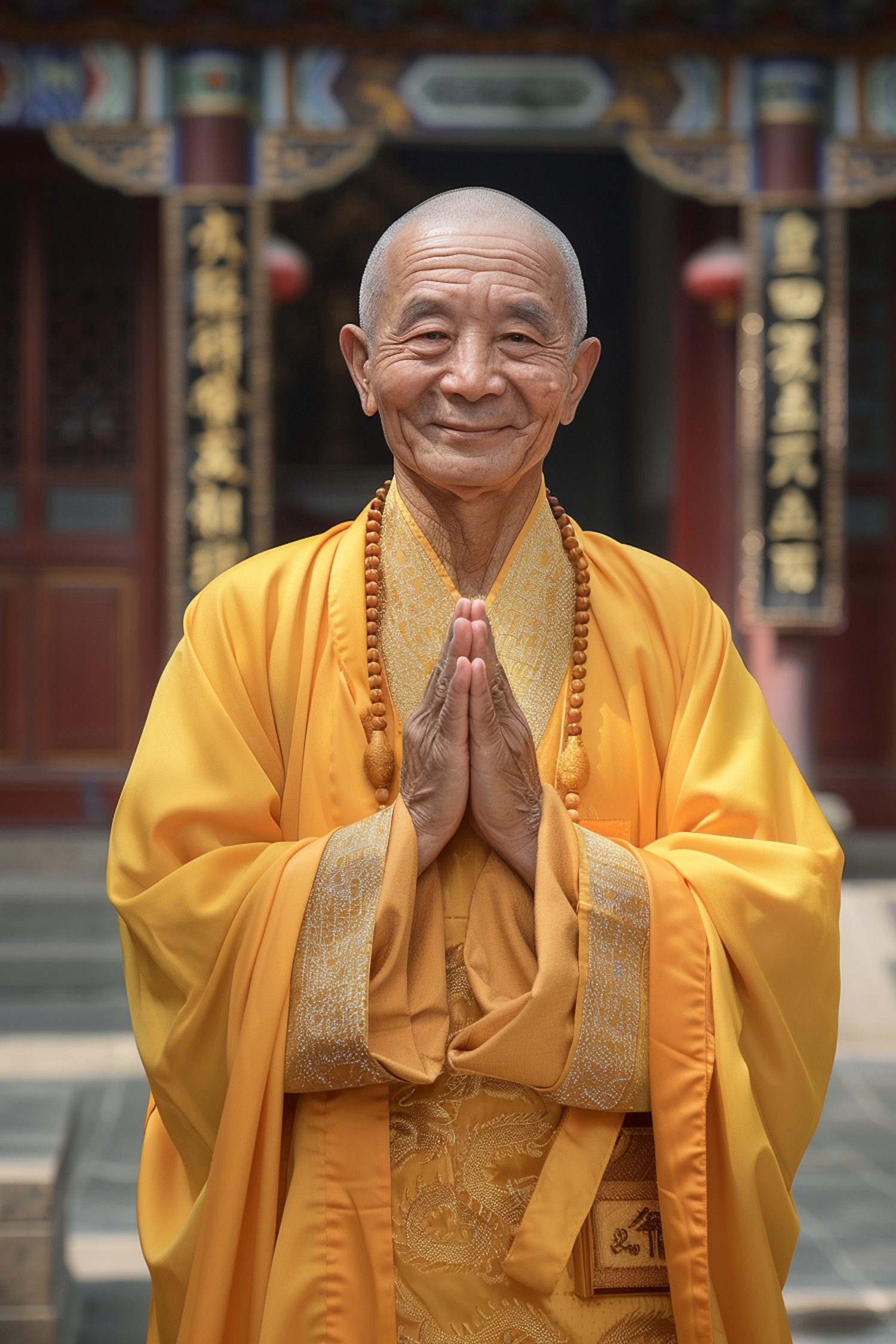 Elderly monk in yellow robes with hands in prayer, standing in front of a traditional temple entrance.
