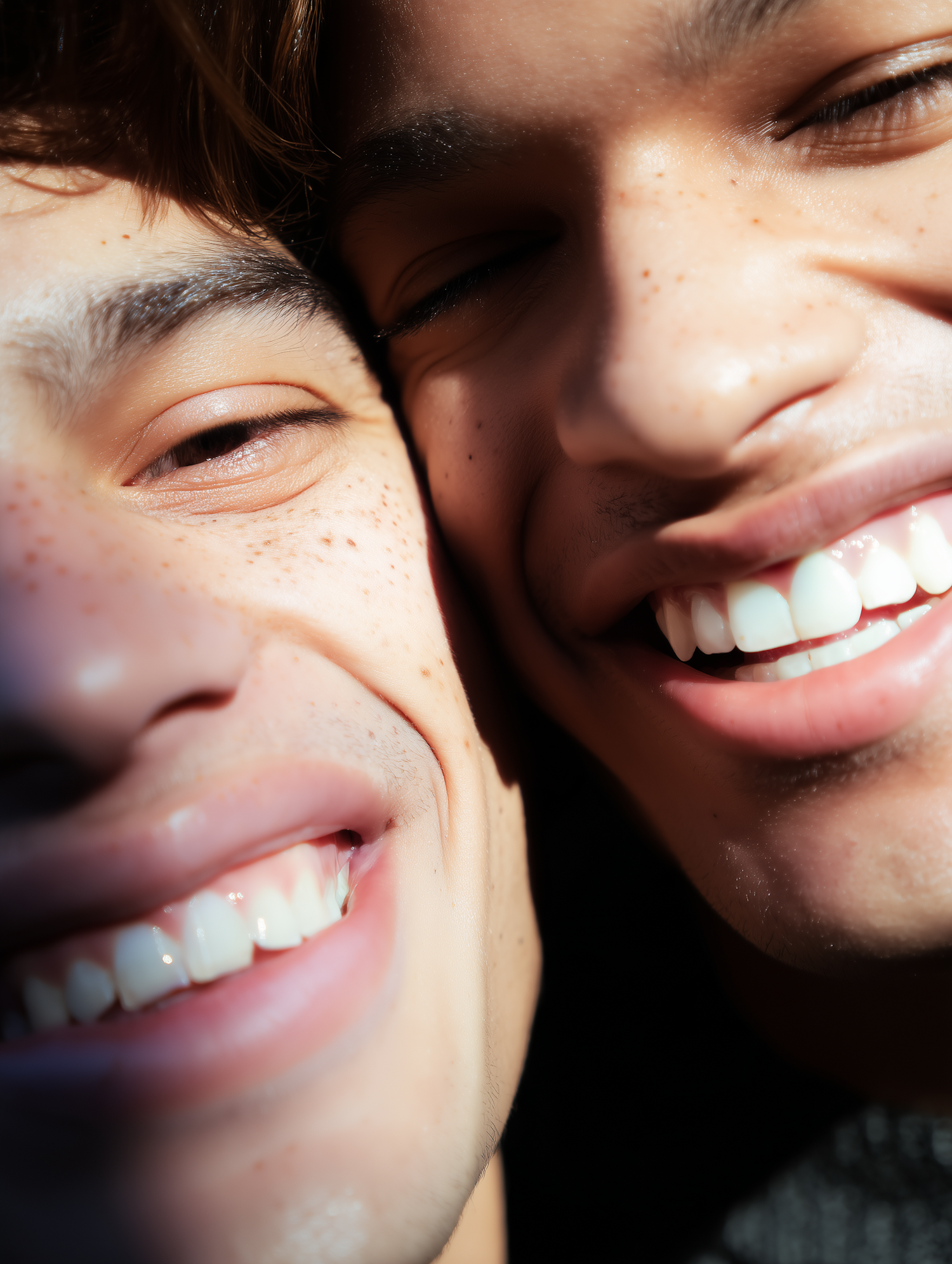 Close-up of two freckled individuals sharing a cheerful moment with wide smiles, under soft natural light.