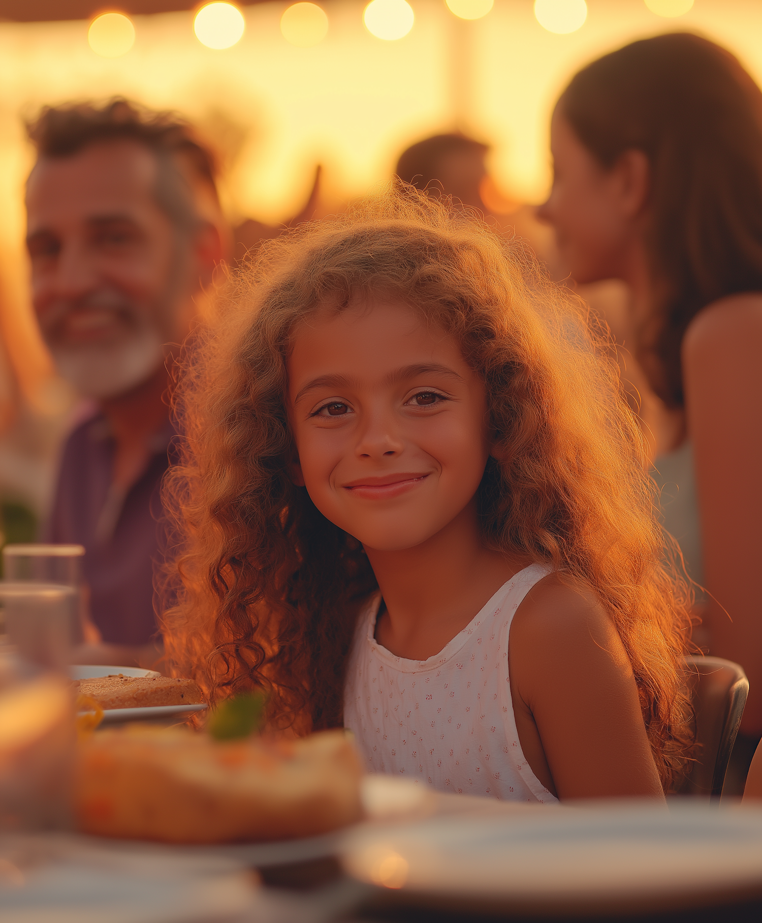 A young girl with curly hair smiles warmly at a dinner table, bathed in golden sunset light, creating a joyful and relaxed atmosphere.