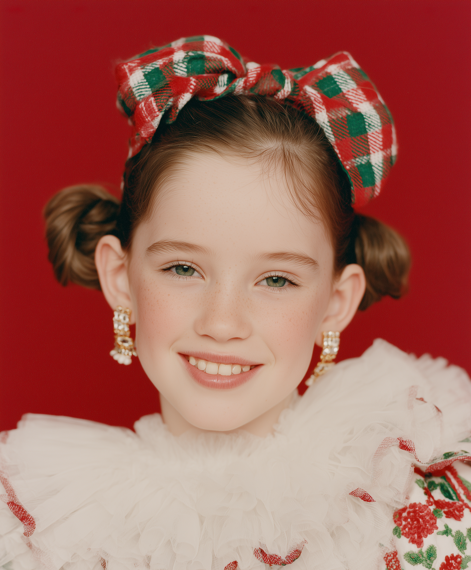 A young girl with a plaid bow and ruffled top smiles warmly against a red background, showcasing a festive and cheerful look.