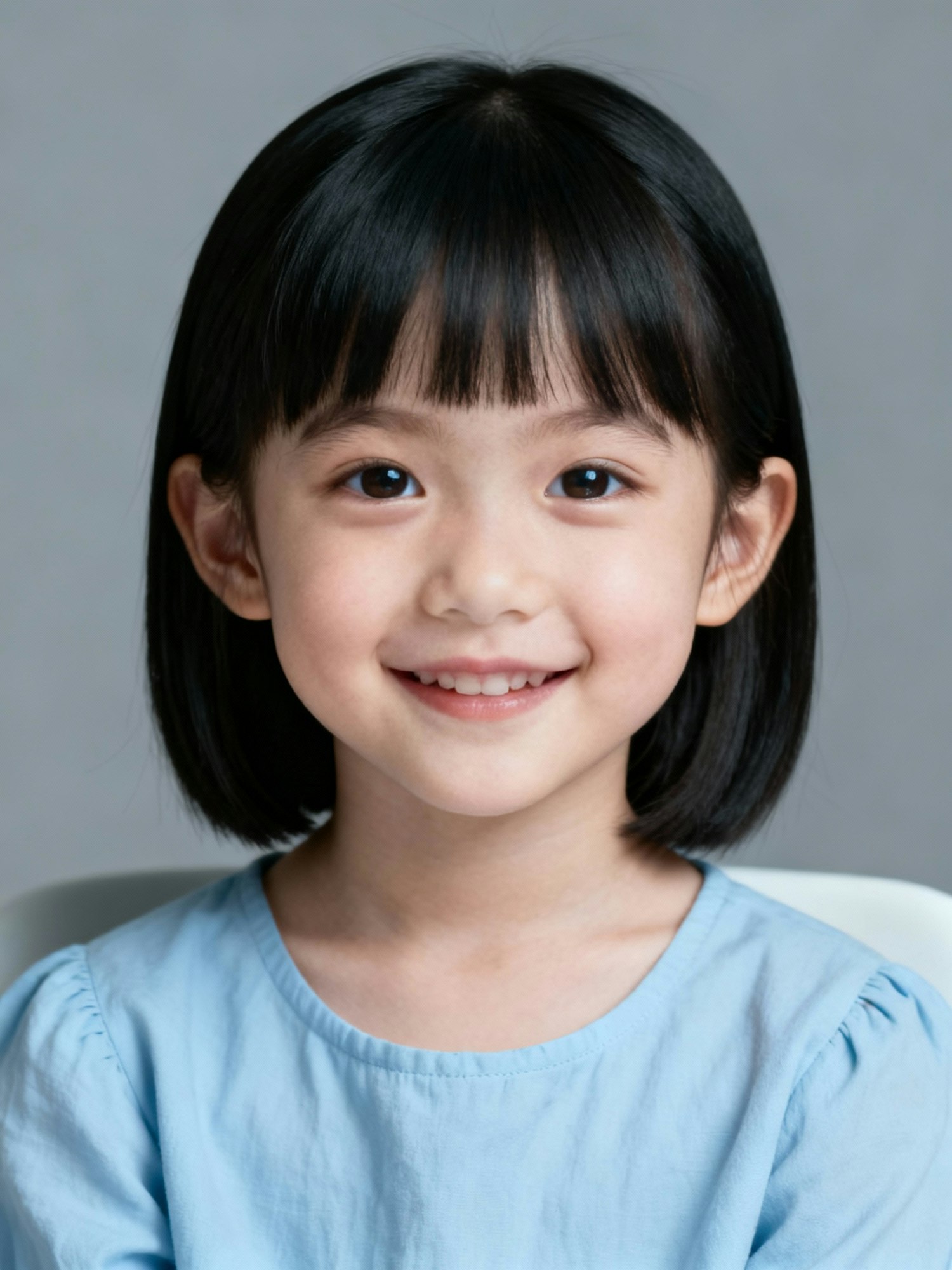 Editorial studio portrait of a child, around 6 years old girl ; joyful and calm expression, eyes bright and natural; clean, cohesive style for a global portrait series. Lighting: clamshell setup with soft key and gentle rim, balanced at 5500 K for even skin tone; soft reflection on eyes for a natural glow. Backdrop: neutral seamless (mid-gray with subtle vignette). Lens: 105 mm macro-sharp detail; photorealistic, editorial quality. Skin: light skin, cool undertone; short straight black hair with bangs; Clothing: pale blue top; calm and composed expression, faint smile. Expression: genuine joy, calm confidence. Negative: harsh shadows, filters, brand logos, watermark, exaggerated features, overly stylized lighting.
