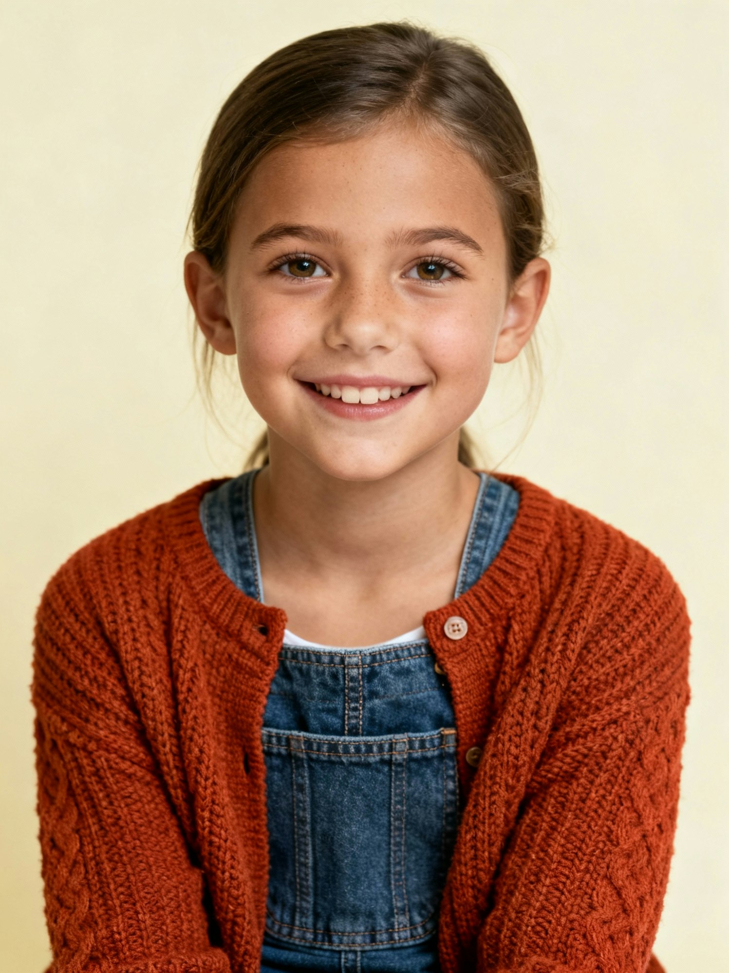 A smiling young girl in an orange cardigan and denim overalls against a soft yellow background, radiating warmth and cheerfulness.