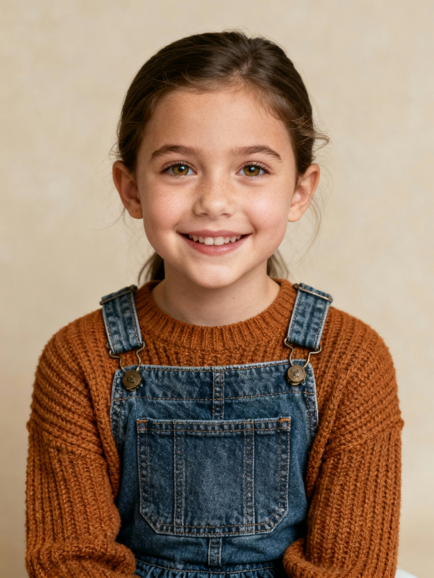 A smiling young girl in a cozy orange sweater and denim overalls, radiating warmth and joy against a soft neutral background.