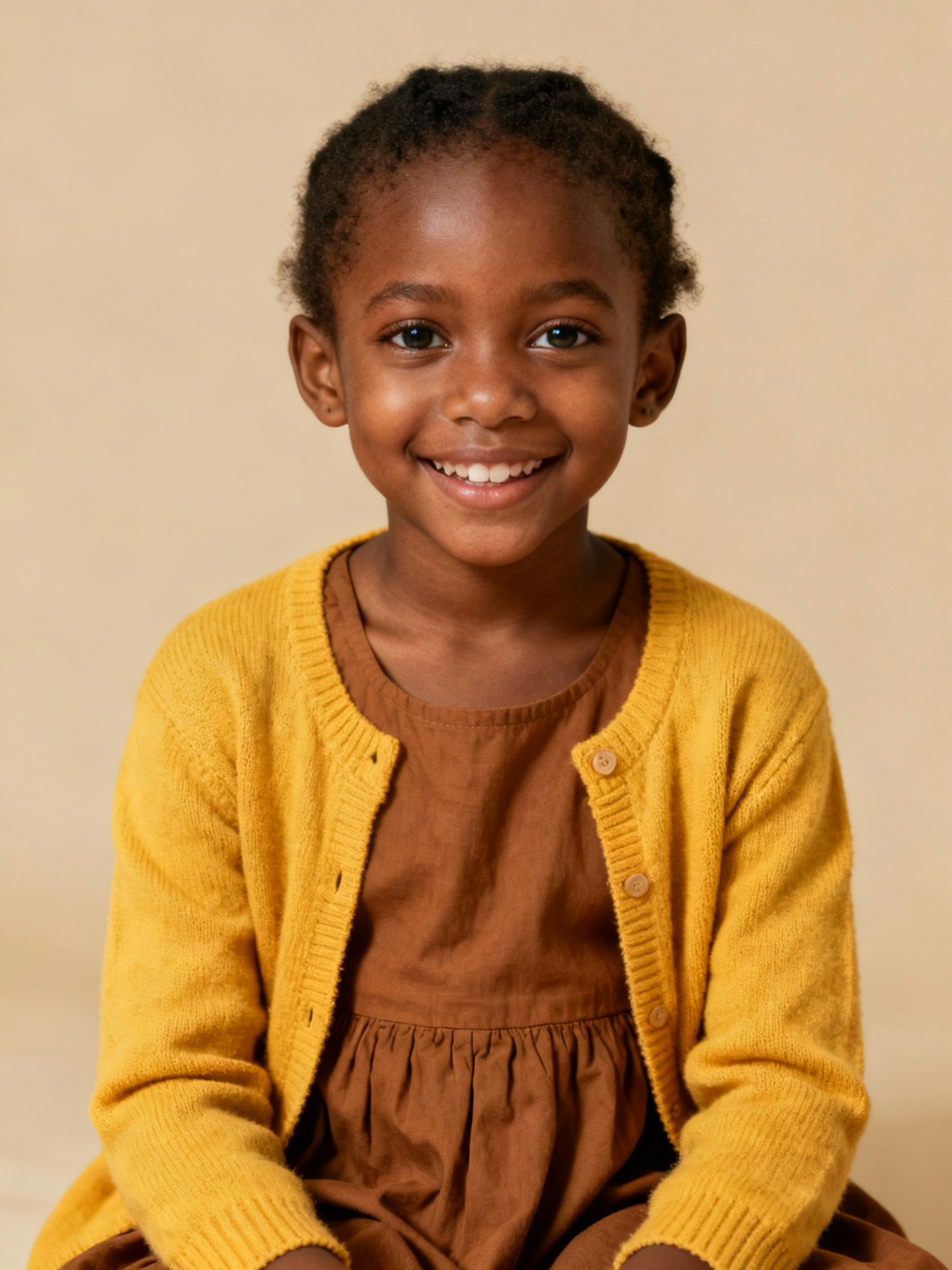 Editorial studio portrait of a Seychellois child, ~6-year-old girl; warm, relaxed joy, eyes bright. Clamshell soft key + rim, 5500 K. Backdrop: light sand-beige seamless. 105 mm macro-sharp. Skin: deep brown, warm undertone. Clothing: marigold knit cardigan over cocoa-brown cotton dress. Negative: harsh contrast, filters, brand logos, watermark.