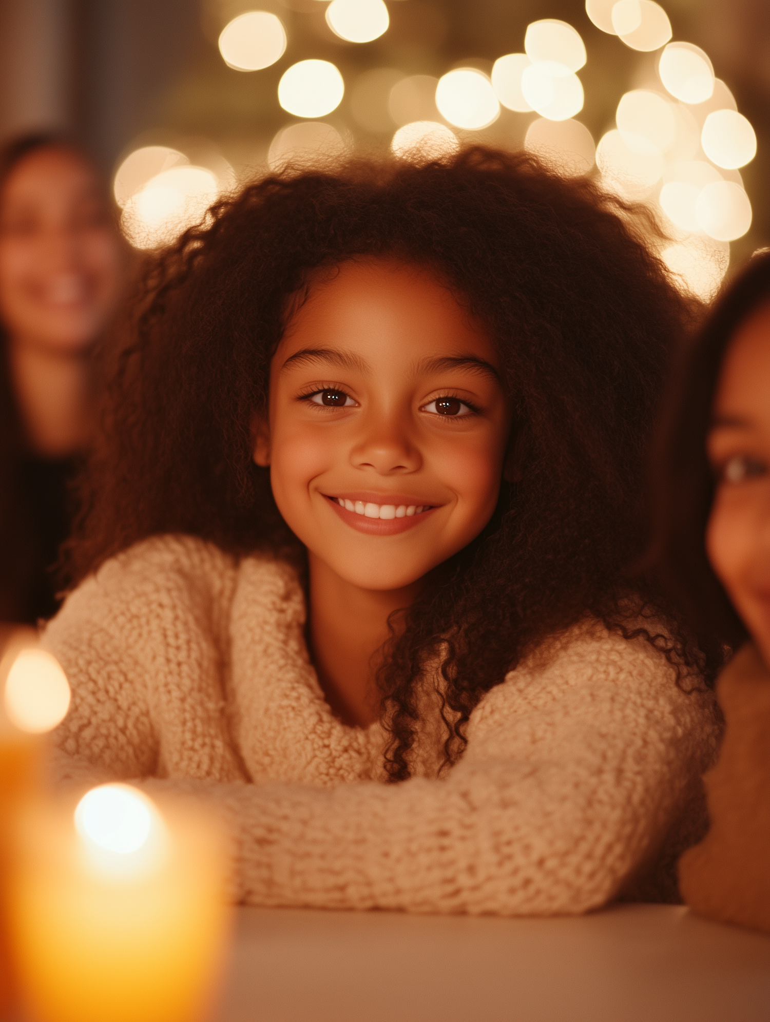 Smiling girl in a cozy sweater with festive lights in the background, creating a warm and joyful atmosphere.