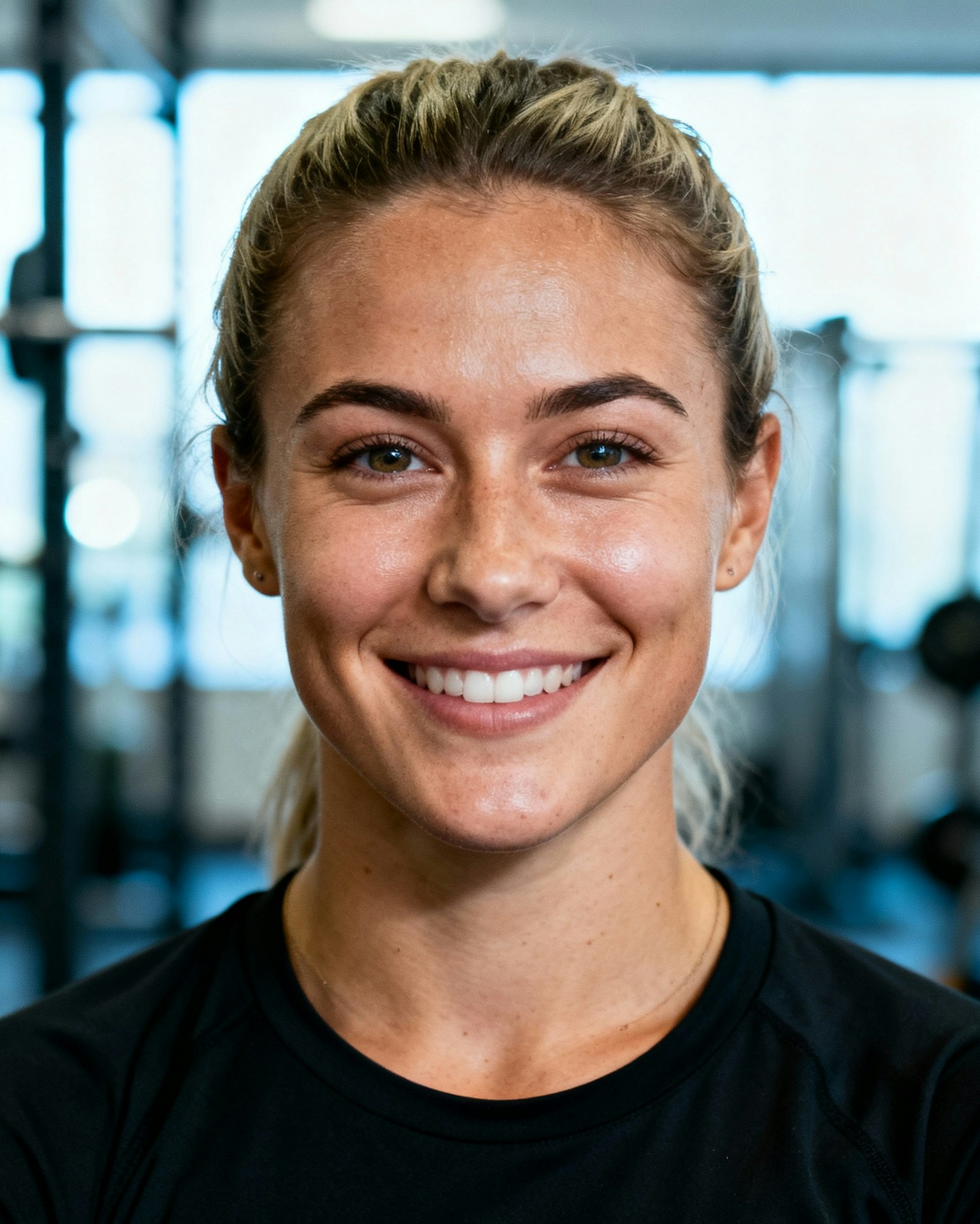 tudio headshot of a woman strength coach, age 29; light-olive skin (neutral). Defocused gym interior (soft bokeh); clamshell soft key + gentle rim; crisp white studio light; 105 mm macro-sharp detail. Framing: tight head-and-shoulders, eyes to camera. Wardrobe: no logo black performance top. Expression: warm, confident smile. Skin: natural glow, lightly smoothed. Negative: over-retouch, logos, watermarks, sweat stains, props, banding. Color-match: Cool daylight white balance (~6700K); subtle blue-gray cast in highlights; low vibrance, clean whites; medium-low contrast with gently lifted shadows; skin tone neutral-cool (no orange cast); key light slightly cool (⅛ CTB), no tungsten spill; background bright, desaturated gym bokeh. Negative: warm/amber tint, orange/teal grade, heavy saturation, yellow skin, tungsten glow.