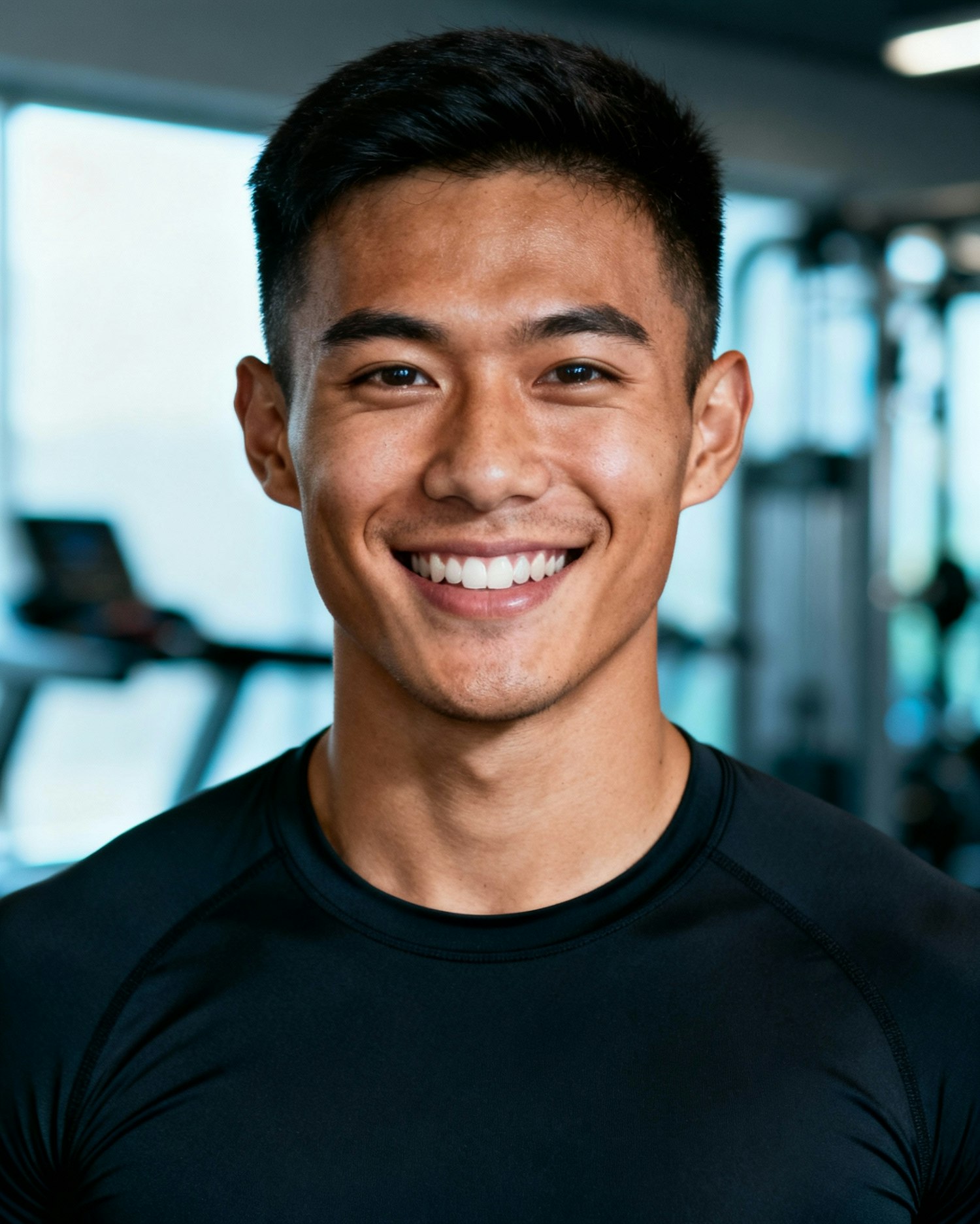 A smiling young man in a gym setting, wearing a black athletic shirt, with exercise equipment blurred in the background.