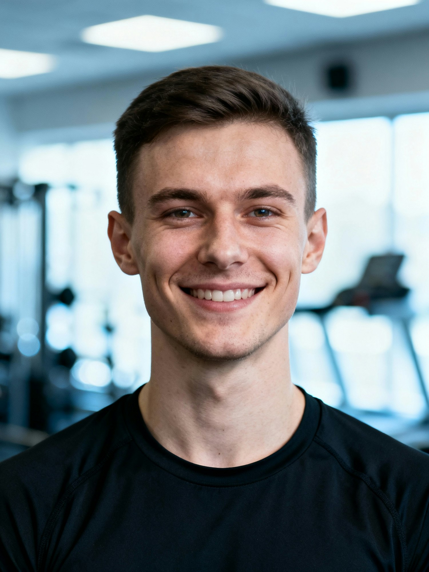 A smiling young man in a gym setting, wearing a black athletic shirt, with short brown hair and blue eyes.
