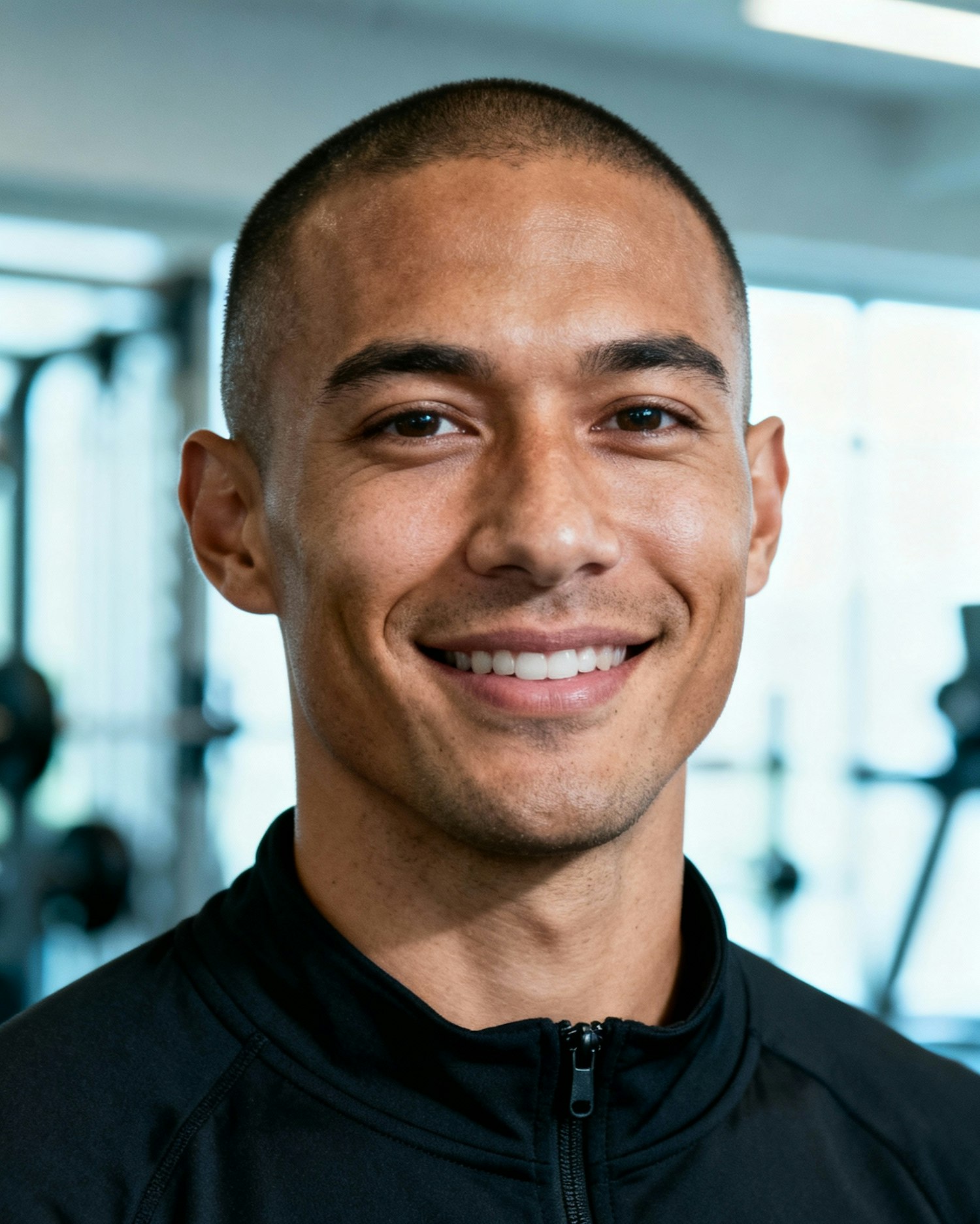 Studio headshot of a man conditioning coach, age 31; light-olive skin (warm). Defocused gym interior (soft bokeh); clamshell soft key + gentle rim; crisp white studio light; 105 mm macro-sharp detail. Framing: tight head-and-shoulders. Wardrobe: non-branded black zip-neck performance top. Expression: relaxed, confident smile. Skin: clean, lightly smoothed. Negative as above. Color-match: Cool daylight white balance (~6700K); subtle blue-gray cast in highlights; low vibrance, clean whites; medium-low contrast with gently lifted shadows; skin tone neutral-cool (no orange cast); key light slightly cool (⅛ CTB), no tungsten spill; background bright, desaturated gym bokeh. Negative: warm/amber tint, orange/teal grade, heavy saturation, yellow skin, tungsten glow.
