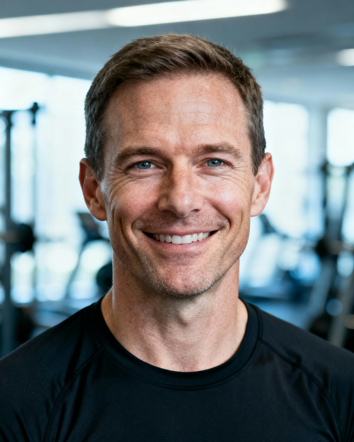 A smiling man in a black shirt with a gym background, showcasing a friendly and approachable demeanor.