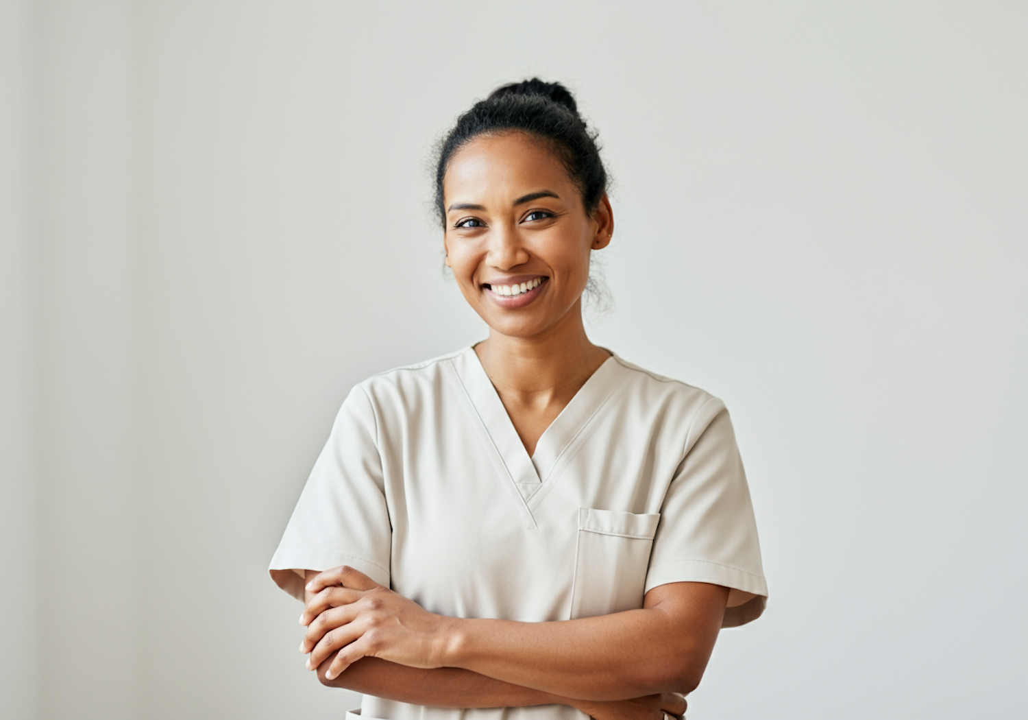 Smiling woman in beige scrubs with arms crossed, exuding confidence and warmth in a professional healthcare setting.