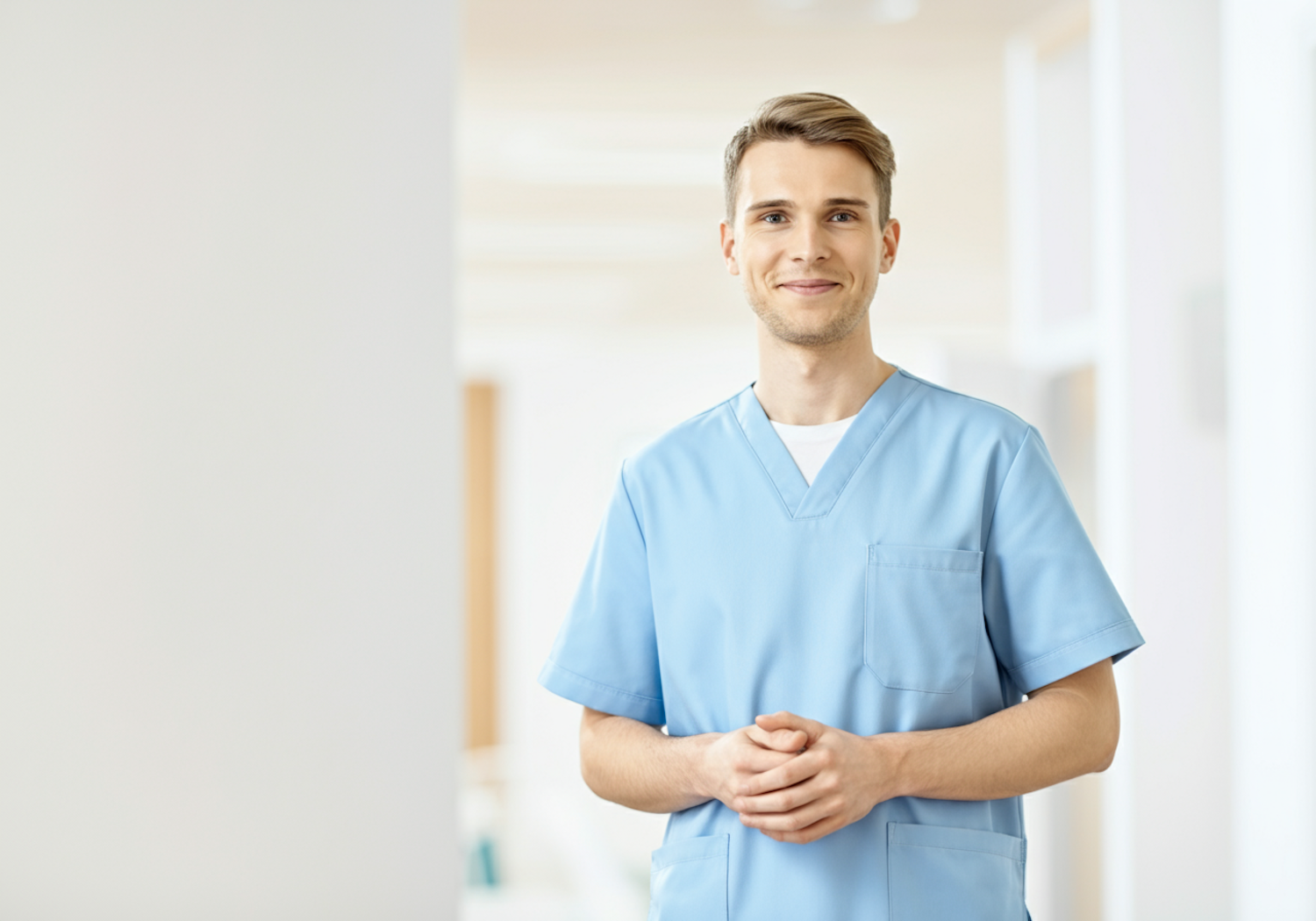 Smiling healthcare professional in light blue scrubs standing in a bright, modern medical environment.
