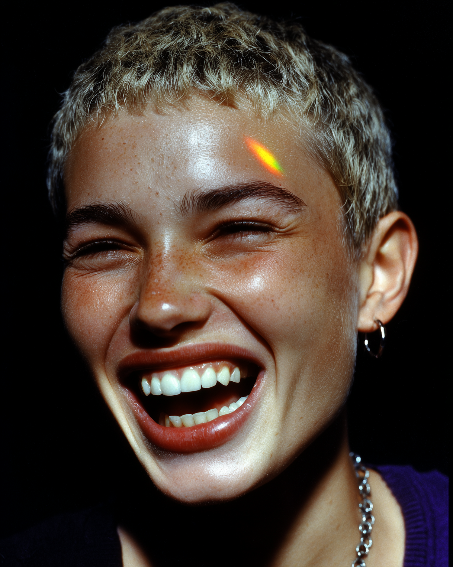 A vibrant close-up of a smiling person with a short blonde hairstyle and freckles, highlighted by a rainbow reflection on their forehead.