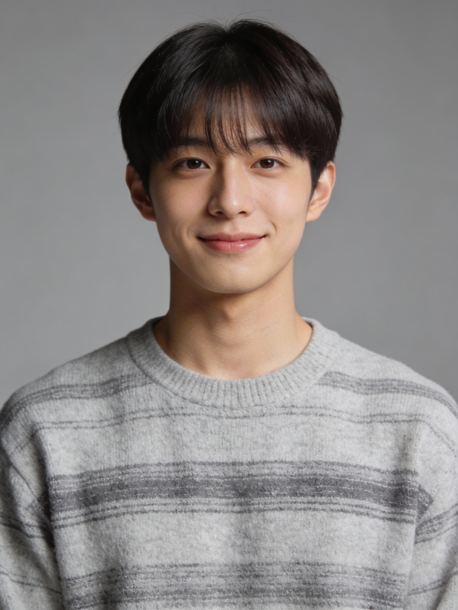 Studio portrait of an East Asian male in his early 20s; light skin, neutral undertone; straight dark hair with a soft natural fringe; clean-shaven. Outfit: light gray knit crewneck top with subtle darker gray horizontal stripes, fine texture, no logos. Neutral mid-gray seamless backdrop; Rembrandt lighting with soft fill; 105 mm macro-sharp. Expression: calm and friendly, small confident smile. Framing: portrait orientation, 3:4 ratio; mid-chest-up, centered at eye level, facing camera; full head and hair inside frame with a little space above; both shoulders visible.