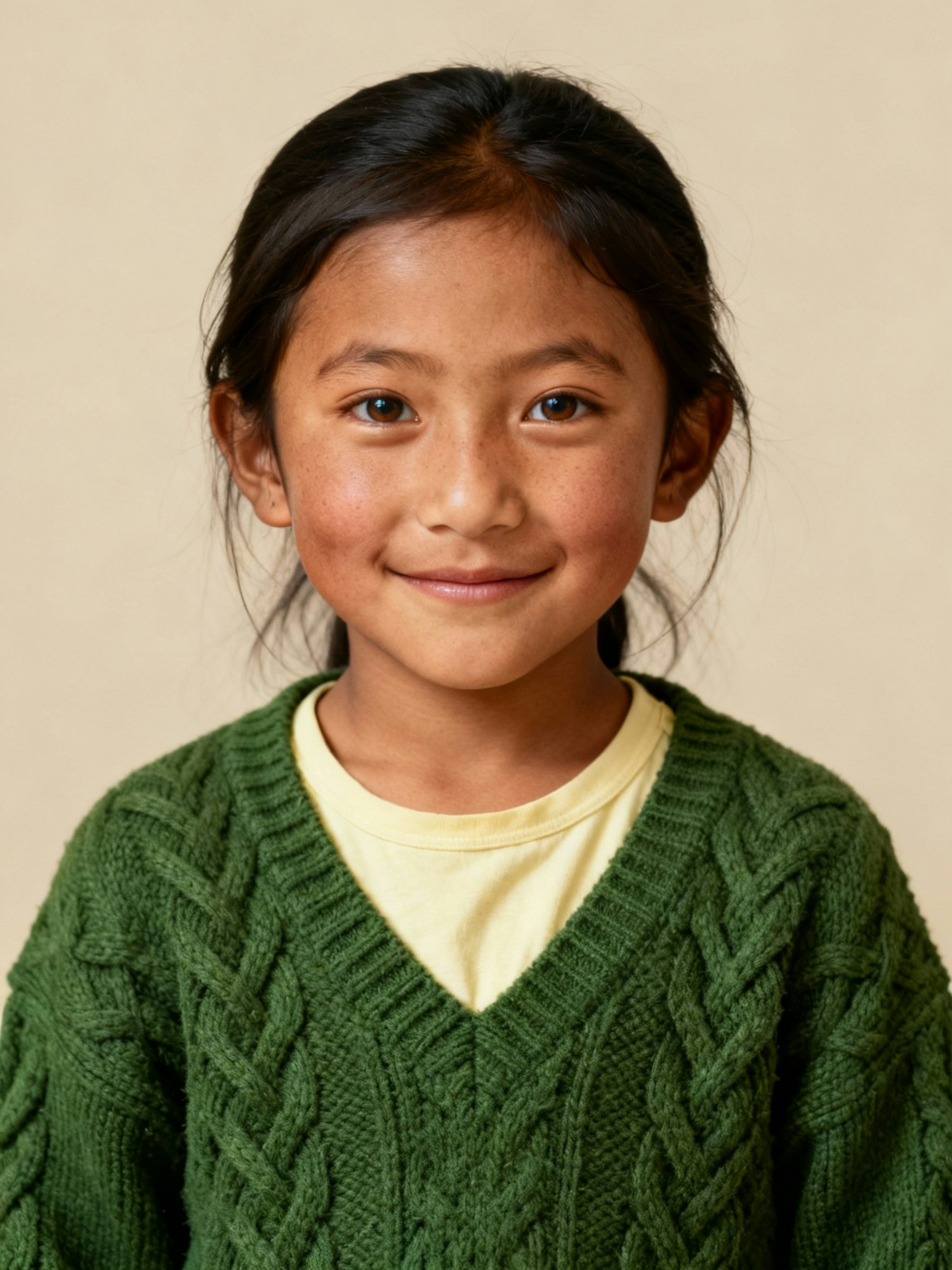 Editorial studio portrait of a Bhutanese child, ~6-year-old girl; joyful-calm expression, bright natural eyes; global portrait series. Lighting: clamshell soft key + gentle rim, daylight balanced at 5500 K; subtle catchlights. Backdrop: light oat-beige seamless with very soft vignette. Lens: 105 mm macro-sharp; photorealistic, editorial. Skin: warm tan, neutral undertone. Clothing: moss-green cable-knit sweater over light-ochre tee. Negative: harsh shadows, filters, brand logos, watermark, exaggerated effects.